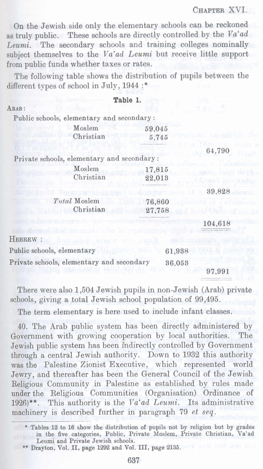 40. The Arab public system has been directly administered by Government with growing cooperation by local authorities. The Jewish public system has been Indirectly controlled by Government through a central Jewish authority. Down to 1932 this authority was the Palestine Zionist Executive, which represented world Jewry, and thereafter has been the General Council of the Jewish Religious Community in Palestine as established by rules made under the Religious Communities (Organisation) Ordinance of 1926)**. This authority is the Va' ad Leumi. Its administrative machinery is described further in paragraph 79 et seq.