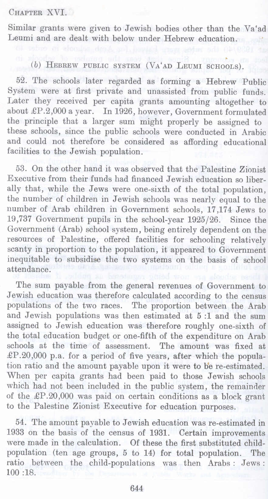 53. On the other hand it was observed that the Palestine Zionist Executive from their funds had financed Jewish education so liberally that, while the Jews were one-sixth of the total population, the number of children in Jewish schools was nearly equal to the number of Arab children in Government schools, 17,174 Jews to 19,737 Government pupils in the school-year 1925/26. Since the Government (Arab) school system, being entirely dependent on the resources of Palestine, offered facilities for schooling relatively scanty in proportion to the population, it appeared to Government inequitable to subsidise the two systems on the basis of school attendance.