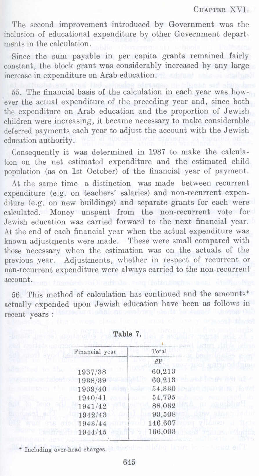 55. The financial basis of the calculation in each year was however the actual expenditure of the preceding year and, since both the expenditure on Arab education and the proportion of Jewish children were increasing 1 it became necessary to make considerable deferred payments each year to adjust the account with the Jewish education authority,