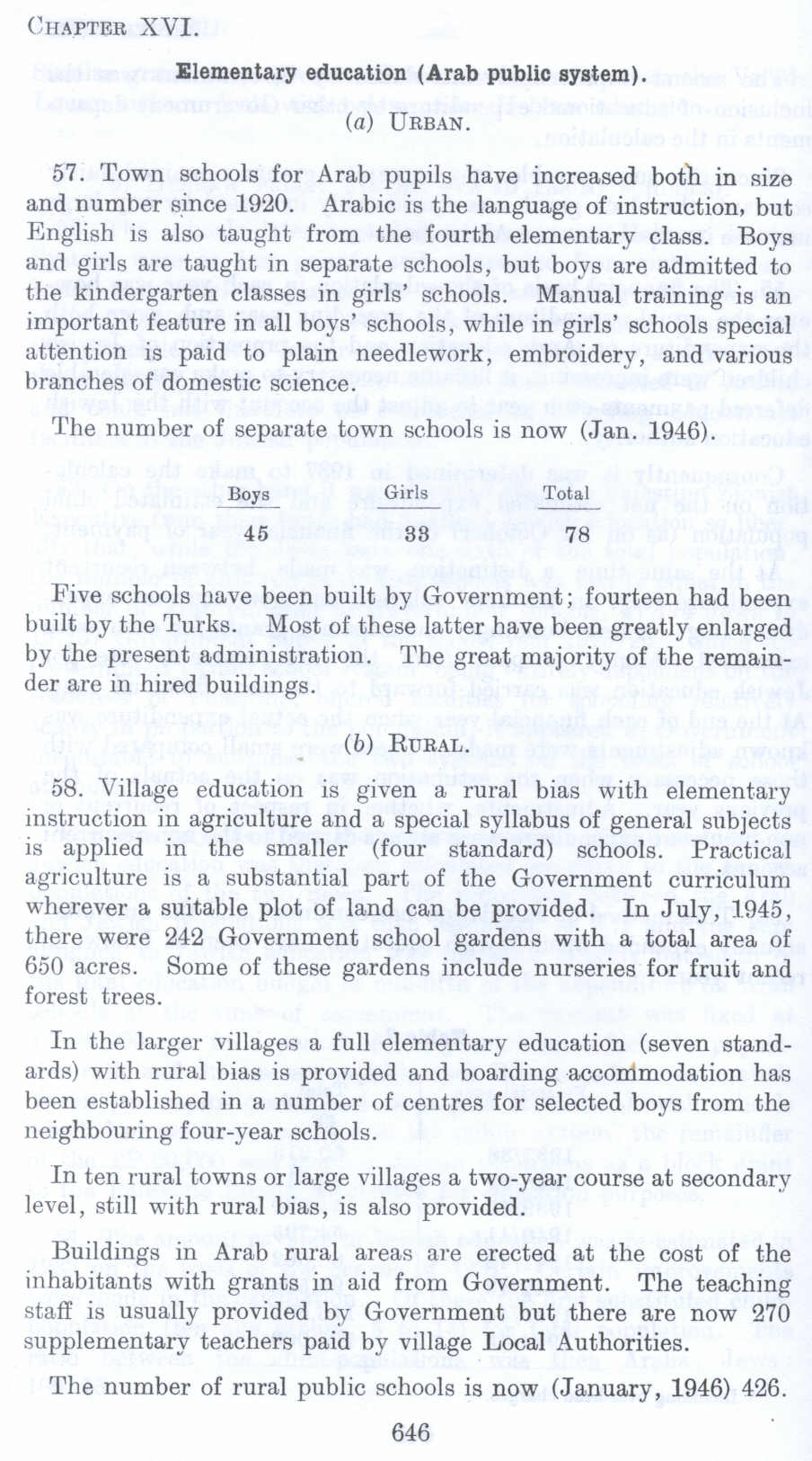 Description of Palestinian Education Systems : Elementary Education (Arabic Public System) in the rural and urban areas in Palestine before 1948 (Nakba), British Mandate: A Survey of Palestine: Volume II - Page 646. Chapter XVI: Social Services : Section 2: |