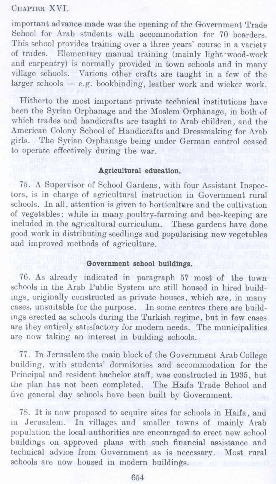 77. In Jerusalem the main block of the Government Arab College building, with students' dormitories and accommodation for the Principal and resident bachelor staff, was constructed in 1935, but the plan has not been completed. The Haifa Trade School and five general day schools have been built by Government.