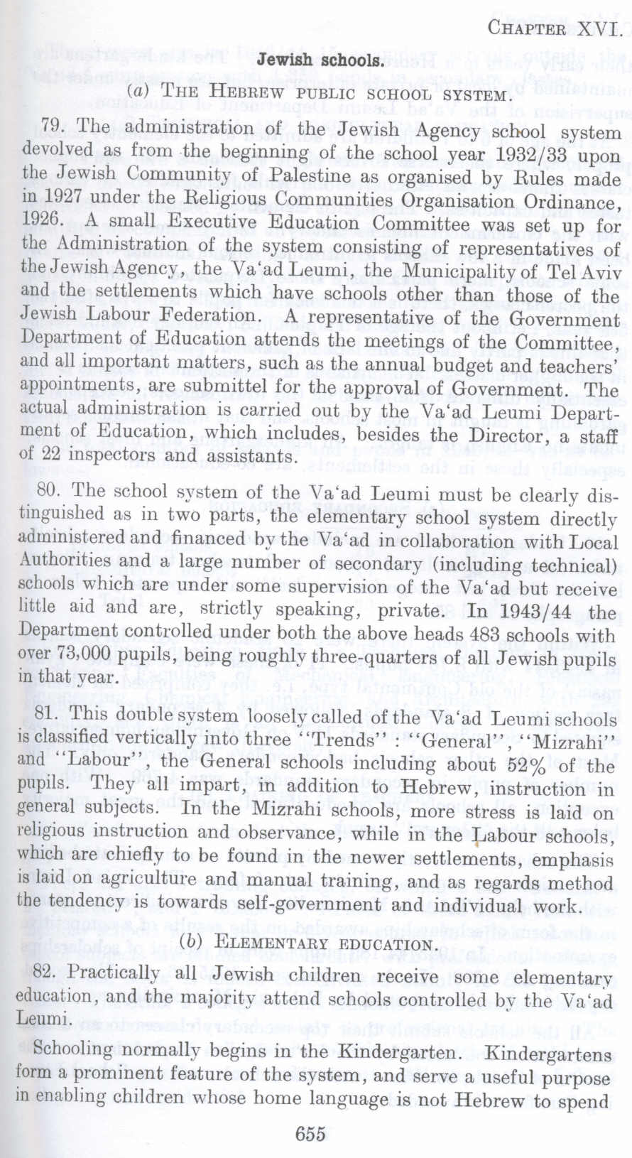 80. The school system of the Vaad Leumi must be clearly distinguished as in two parts, the elementary school system directly administered and financed by the Va'ad in collaboration with Local Authorities and a large number of secondary (including technical) schools which are under some supervision of the Vaad but receive little aid and are, strictly speaking, private. In 1943/44 the Department controlled under both the above heads 483 schools with over 73,000 pupils, being roughly three-quarters of all Jewish pupils in that year.