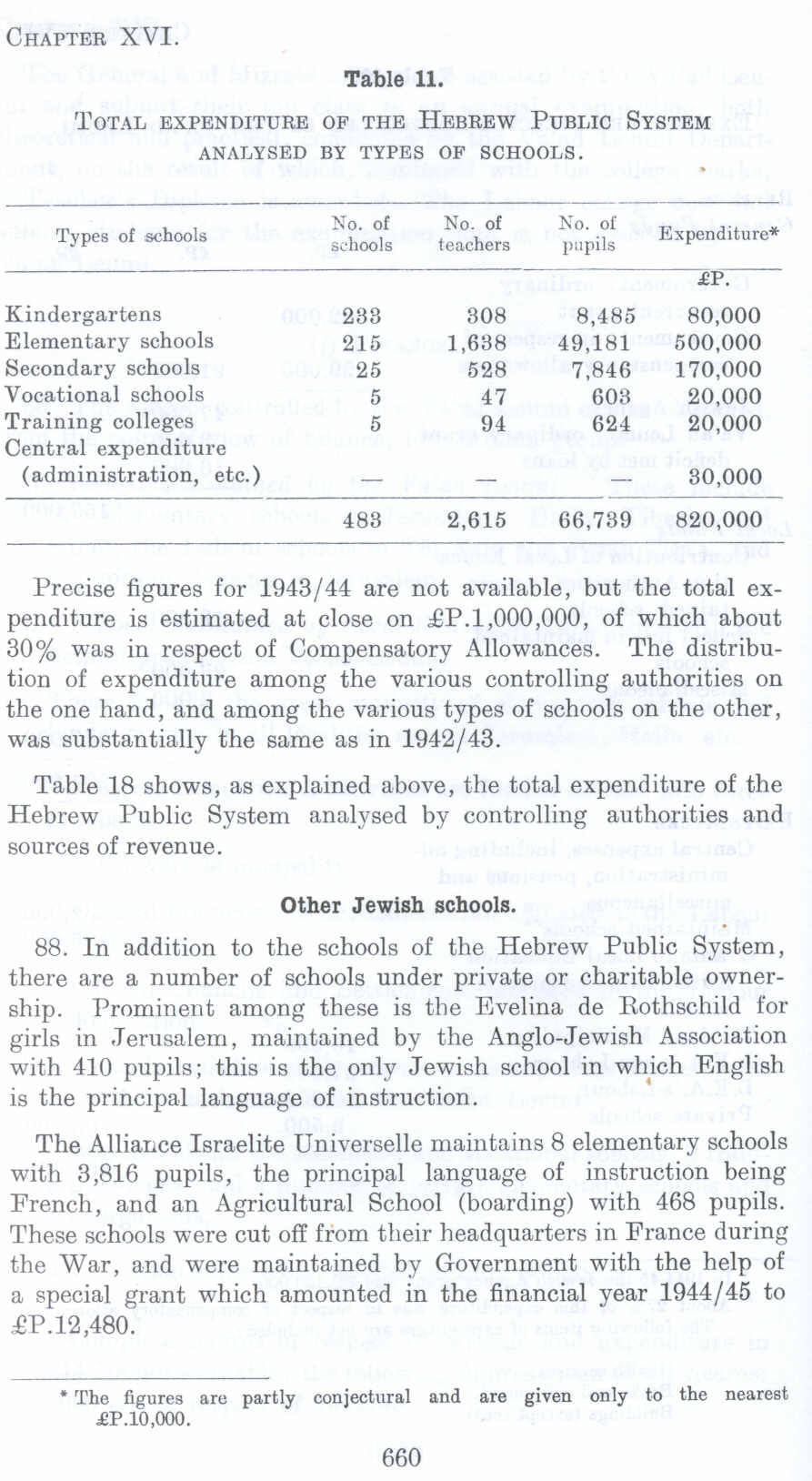 Zionist/Jewish Schools in Palestine before Nakba: Table 11 showing the Total Expenditure of The Hebrew Public System Analyzed By Types of Schools in Palestine before 1948 (Nakba), British Mandate: A Survey of Palestine: Volume II - Page 660. Chapter XVI: Social Services : Section 2: Description of Education Systems