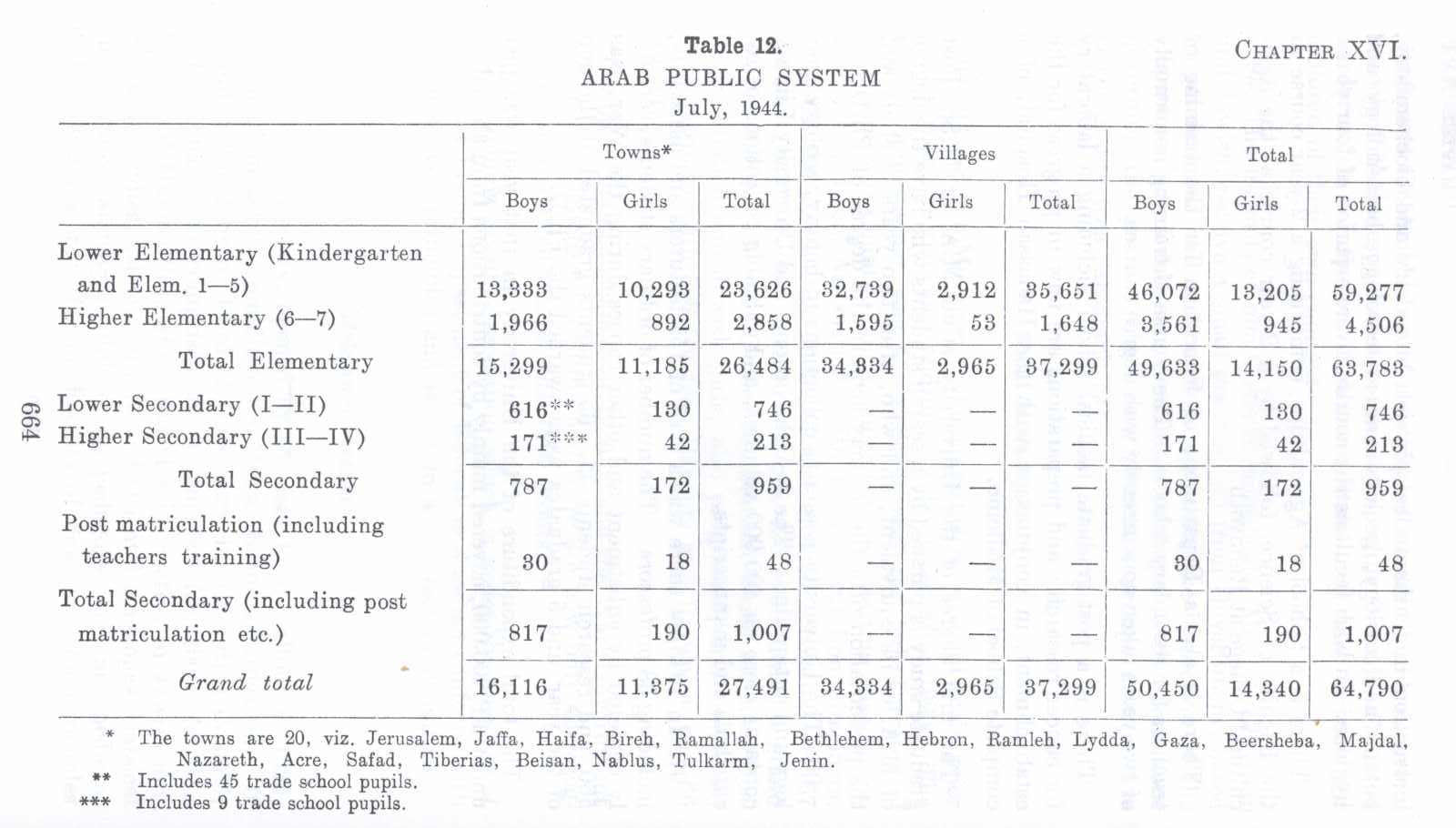General Statistics For Arab Public System in Palestine before 1948 (Nakba), British Mandate: A Survey of Palestine: Volume II - Page 664. Chapter XVI: Social Services : Section 2: Description of Education Systems : Table 12: |