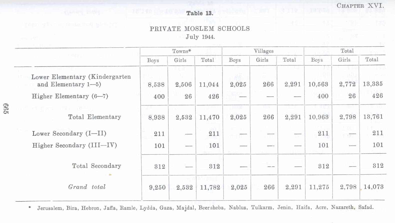 Table showing General Statistics For Private Muslim Schools in Palestine before 1948 (Nakba), British Mandate: A Survey of Palestine: Volume II - Page 665. Chapter XVI: Social Services : Section 2: Description of Education Systems : Table 13 |