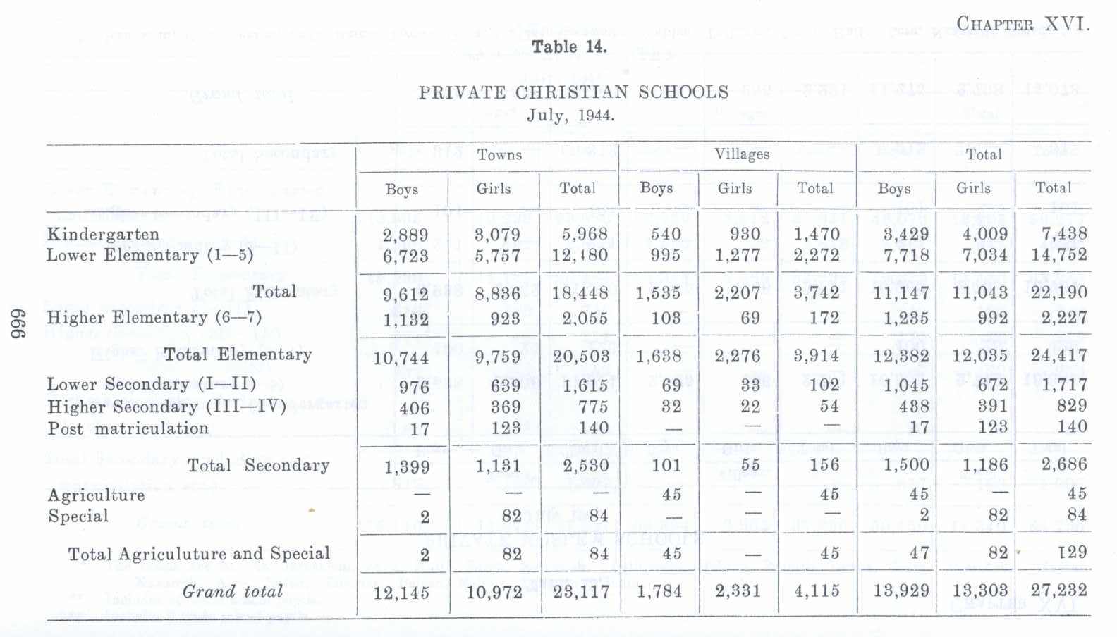 Table showing General Statistics For Private Christian Schools in Palestine before 1948 (Nakba), British Mandate: A Survey of Palestine: Volume II - Page 666. Chapter XVI: Social Services : Section 2: Description of Education Systems : Table 14 |