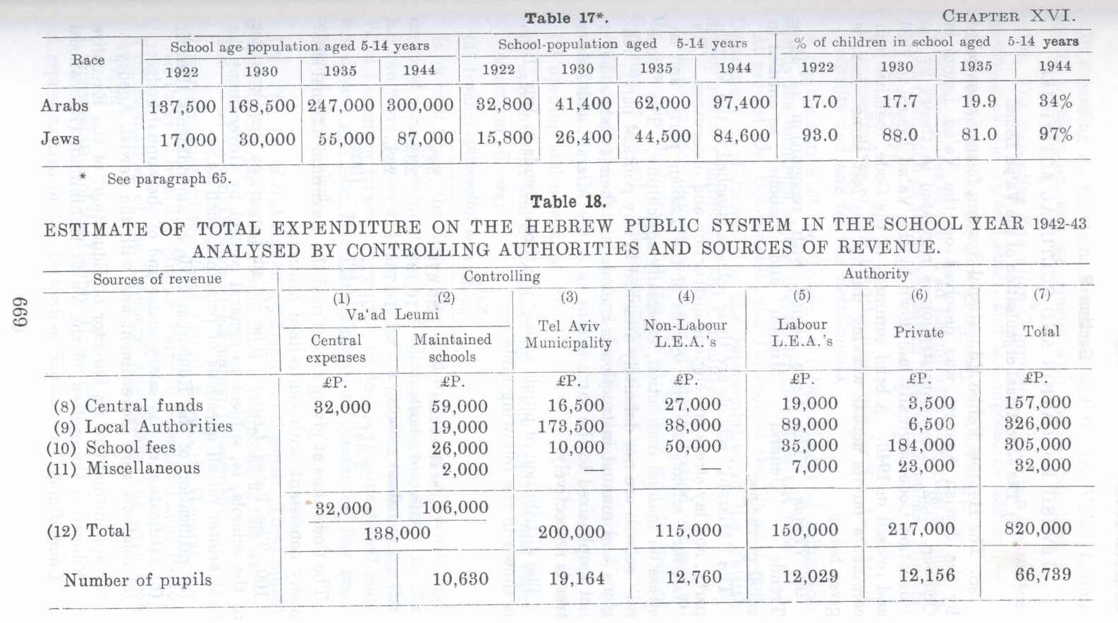 Table showing Estimate of Total Expenditure on The Hebrew Public System, 1942/43 in Palestine before 1948 (Nakba), British Mandate: A Survey of Palestine: Volume II - Page 669. Chapter XVI: Social Services : Section 2: Description of Education Systems : Table 18 |