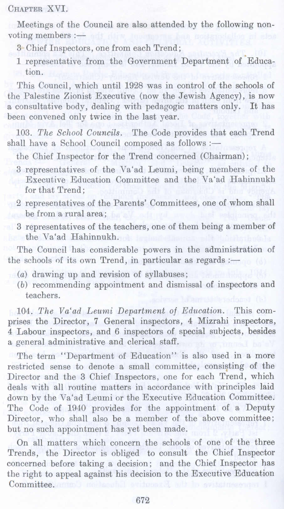 104. The Va'ad Leumi Department of Education. This comprises the Director, 7 General inspectors, 4 Mizrahi inspectors, 4 Labour inspectors, and 6 inspectors of special subjects, besides a general administrative and clerical staff.