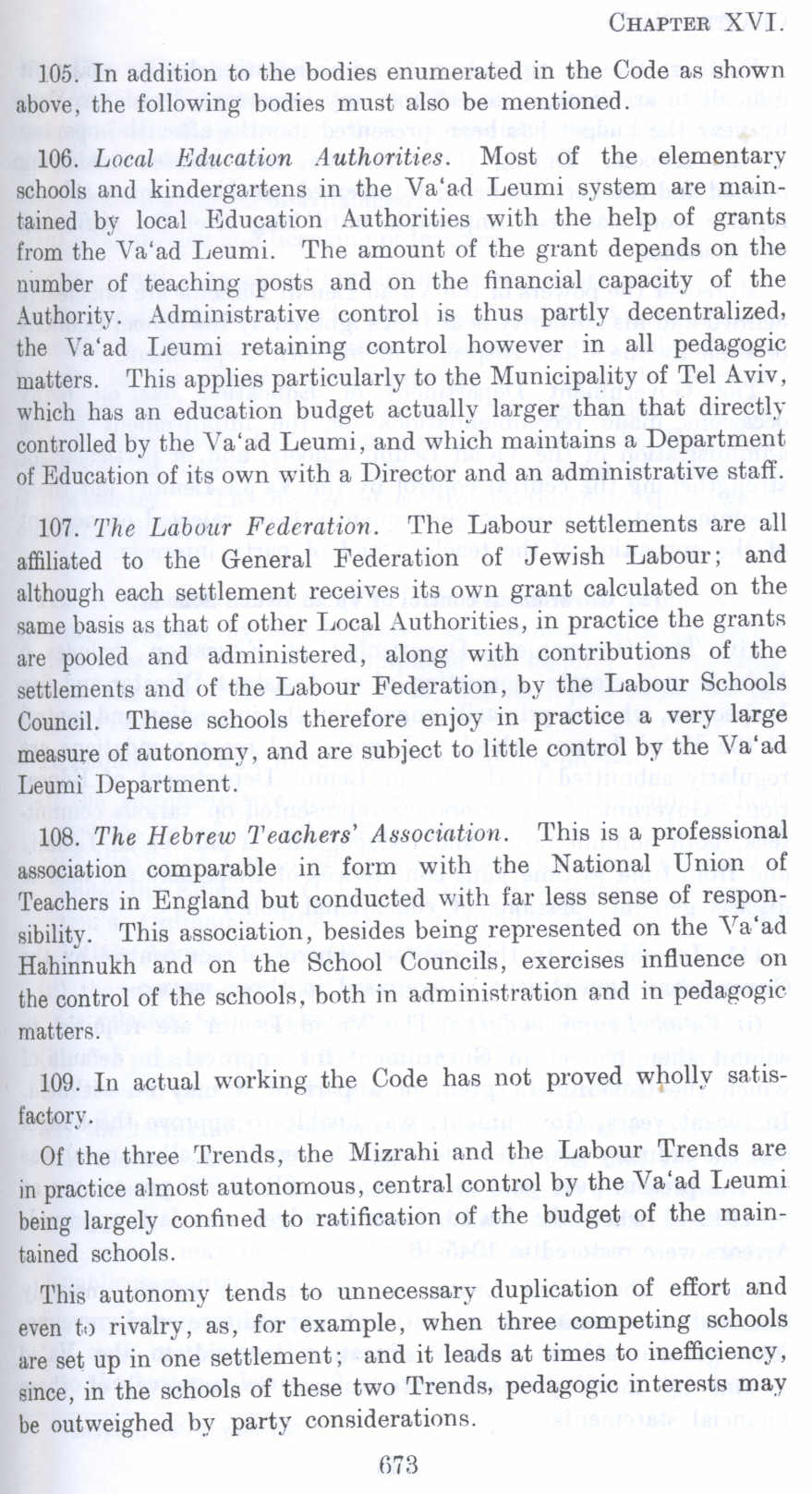 107. The Labour Federation. The Labour settlements are all affiliated to the General Federation of Jewish Labour; and although each settlement receives its own grant calculated on the same basis as that of other Local Authorities, in practice the grants are pooled and administered, along with contributions of the settlements and of the Labour Federation, by the Labour Schools Council. These schools therefore enjoy in practice a very large measure of autonomy, and are subject to little control by the Va'ad Leumi Department.