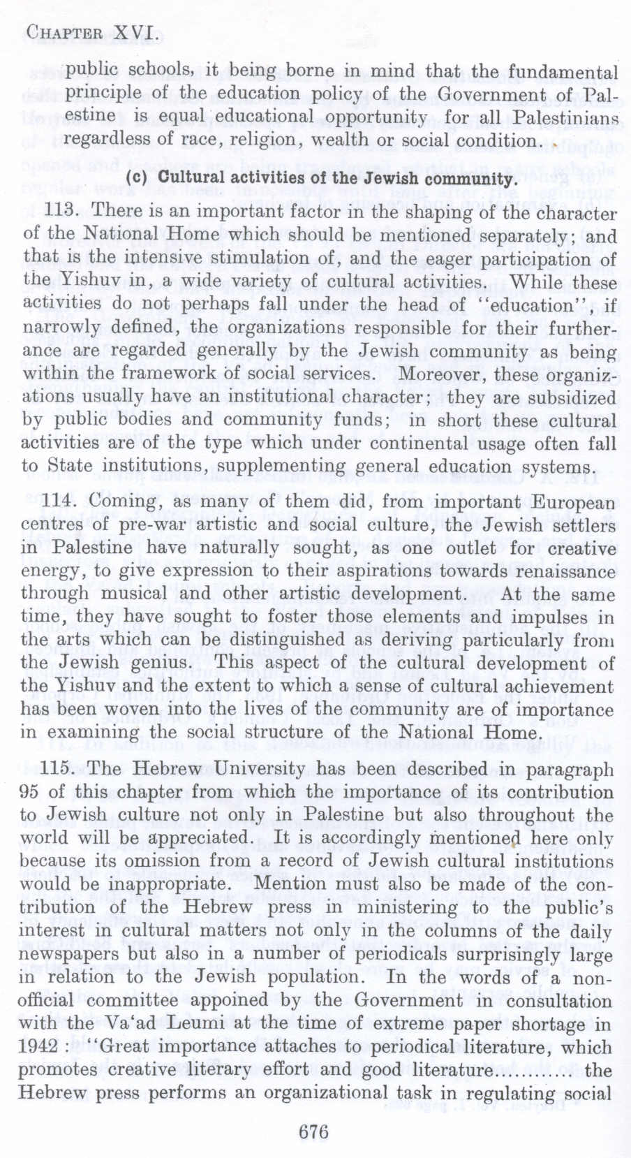 115. The Hebrew University has been described in paragraph 95 of this chapter from which the importance of its contribution to Jewish culture not only in Palestine but also throughout the world will be appreciated. It is accordingly mentioned here only because its omission from a record of Jewish cultural institutions would be inappropriate. Mention must also be made of the contribution of the Hebrew press in ministering to the public's interest in cultural matters not only in the columns of the daily newspapers but also in a number of periodicals surprisingly large in relation to the Jewish population. In the words of a nonofficial committee appointed by the Government in consultation with the Va'ad Leumi at the time of extreme paper shortage in 1942 : "Great importance attaches to periodical literature, which promotes creative literary effort and good literature........ the Hebrew press performs an organizational task in regulating social