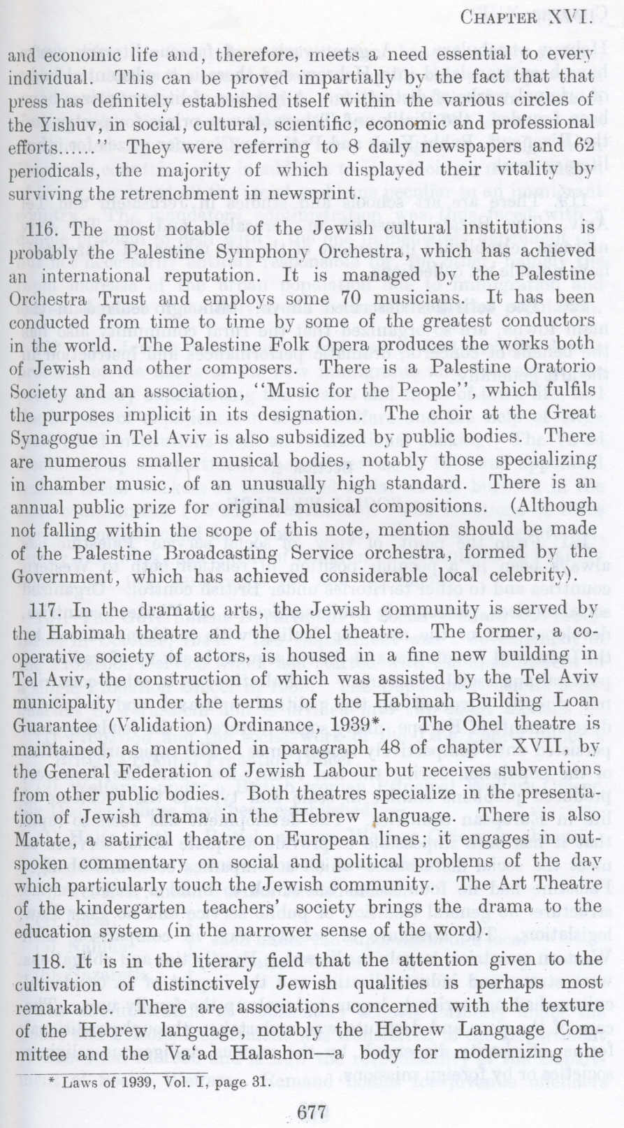 116. The most notable of the Jewish cultural institutions is probably the Palestine Symphony Orchestra, which has achieved an international reputation. It is managed by the Palestine Orchestra Trust and employs some 70 musicians. It has been conducted from time to time by some of the greatest conductors in the world. The Palestine Folk Opera produces the works both of Jewish and other composers. There is a Palestine Oratorio Society and an association, "Music for the People", which fulfils the purposes implicit in its designation. The choir at the Great Synagogue in Tel Aviv is also subsidized by public bodies. There are numerous smaller musical bodies, notably those specializing in chamber music, of an unusually high standard. There is an annual public prize for original musical compositions. (Although not falling within the scope of this note, mention should be made of the Palestine Broadcasting Service orchestra, formed by the Government, which has achieved considerable local celebrity).