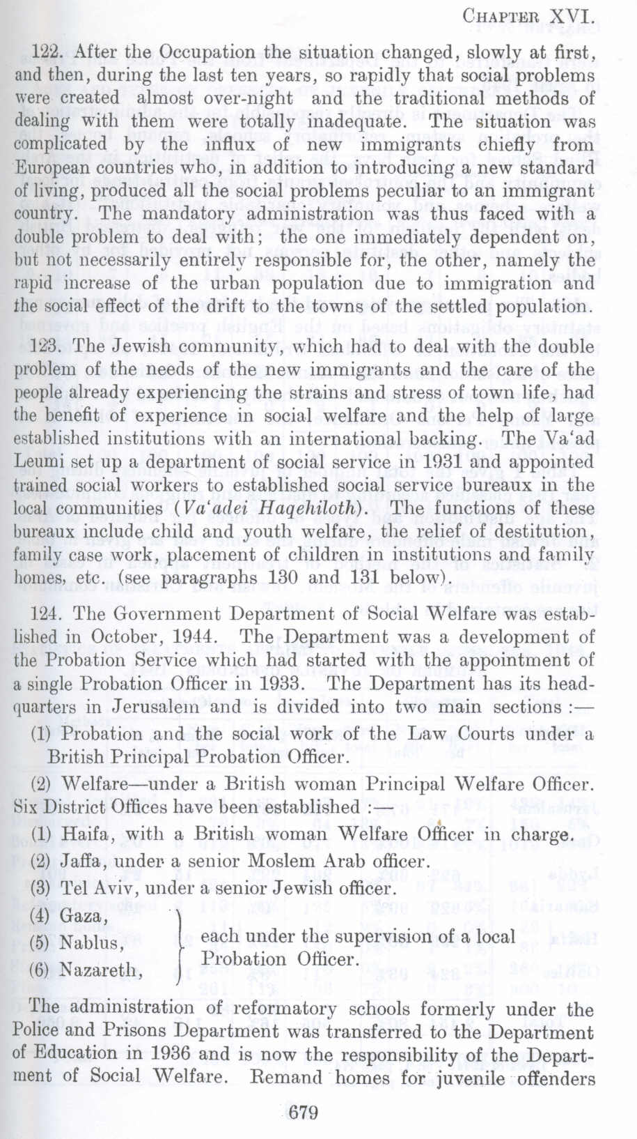 122. After the Occupation the situation changed, slowly at first, and then, during the last ten years, so rapidly that social problems were created almost over-night and the traditional methods of dealing with them were totally inadequate. The situation was complicated by the influx of new immigrants chiefly from European countries who, in addition to introducing a new standard of living, produced all the social problems peculiar to an immigrant country. The mandatory administration was thus faced with a double problem to deal with; the one immediately dependent on, but not necessarily entirely responsible for, the other, namely the rapid increase of the urban population due to immigration and The social effect of the drift to the towns of the settled population.