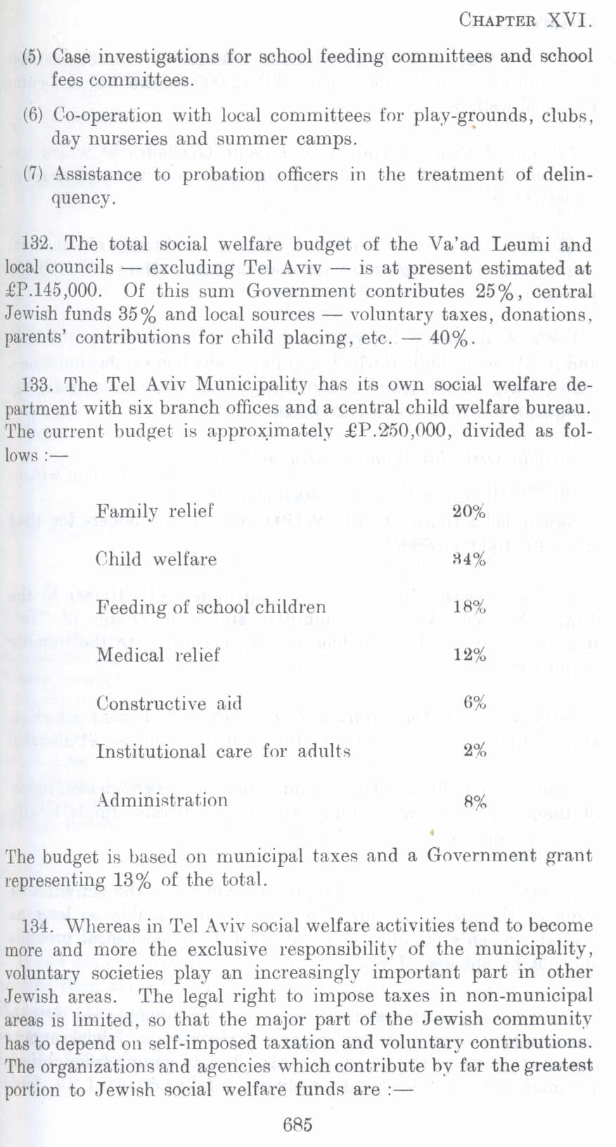 132. The total social welfare budget of the Va'ad Leumi and local councils - excluding Tel Aviv - is at present estimated at £P.145,000. Of this sum Government contributes 25%, central Jewish funds 35% and local sources - voluntary taxes, donations. parents' contributions for child placing, etc. - 40%.