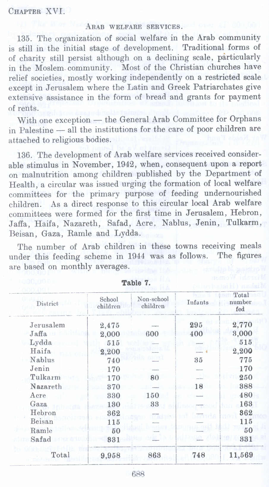 The number of Arab children in these towns receiving meals under this feeding scheme in l944 was as follows. The figures are based on monthly averages.