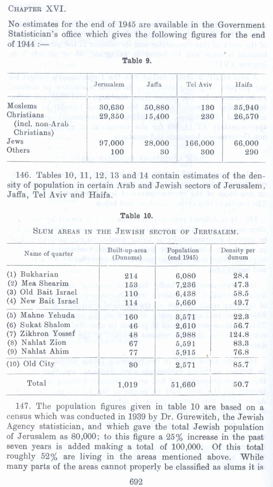 147. The population figures given in table 10 are based on a census which was conducted in 1939 by Dr. Gurewitch, the Jewish Agency statistician, and which gave the total Jewish population of Jerusalem as 80,000; to this figure a 25% increase in the past seven years is added making a total of 100,000. Of this total roughly 52% are living in the areas mentioned above. While many parts of the areas cannot properly be classified as slums it is