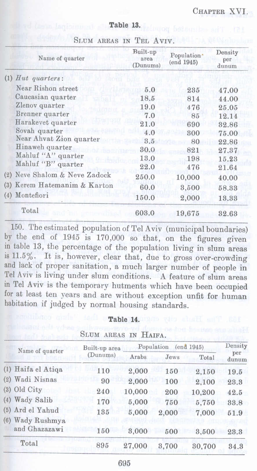 150. The estimated population of Tel Aviv (municipal boundaries) by the end of 1945 is 170,000 so .that, on the figures given in table 13, the percentage of the population living in slum areas is 11.5%. It is, however, clear that, due to gross over-crowding and lack of proper sanitation, a much larger number of people in Tel Aviv is living under slum conditions. A feature of slum areas in Tel Aviv is the temporary hutments which have been occupied for at least ten years and are without exception unfit for human habitation if judged by normal housing standards.