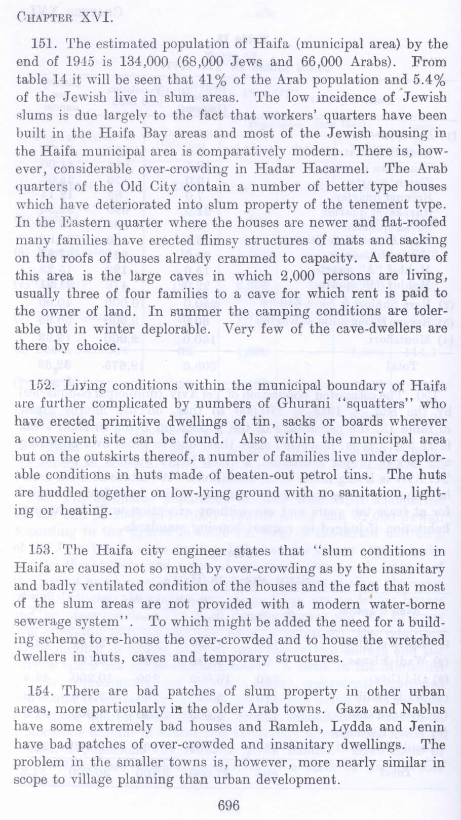 151. The estimated population of Haifa (municipal area) by the end of 1945 is 134,000 (68,000 Jews and 66,000 Arabs). From table 1-1 it will be seen that 41 % of the Arab population and 5.4% of the Jewish live in slum areas. The low incidence of •Jewish slums is due largely to the fact that workers' quarters have been built in the Haifa Bay areas and most of the Jewish housing in the Haifa municipal area is comparatively modern. There is, however, considerable over-crowding in Hadar Hacarmel. The Arab quarters of the Old City contain a number of better type houses which have deteriorated into slum property of the tenement type. In the Eastern quarter where the houses are newer and flat-roofed many families have erected flimsy structures of mats and sacking on the roofs of houses already crammed to capacity. A feature of this area is the large caves in which 2,000 persons are living, usually three of four families to a cave for which rent is paid to the owner of land. Jn summer the camping conditions are tolerable but in winter deplorable. Very few of the cave-dwellers are there by choice.