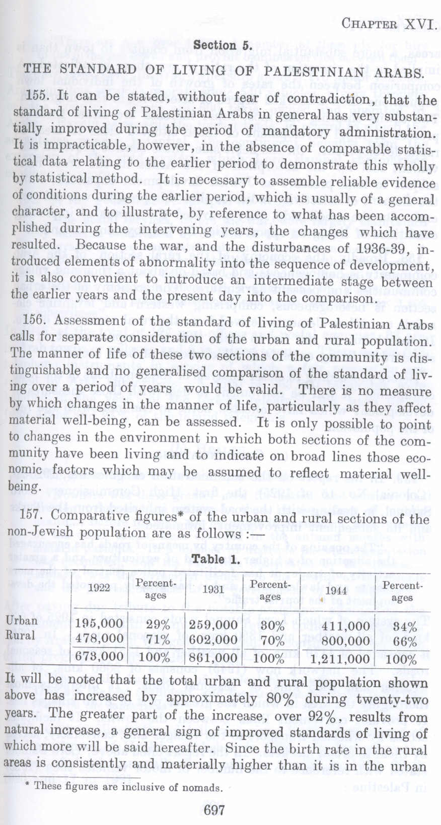 156. Assessment of the standard of living of Palestinian Arabs calls for separate consideration of the urban and rural population. The manner of life of these two sections of the community is distinguishable and no generalised comparison of the standard of living over a period of years would be valid. There is no measure by which changes in the manner of life, particularly as they affect material well-being, can be assessed. It is only possible to point to changes in the environment in which both sections of the community have been living and to indicate on broad lines those economic factors which may be assumed to reflect material well being.