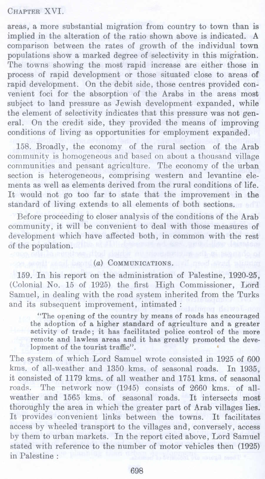 159. In his report on the administration of Palestine, 1920-25, (Colonial No. 15 of In25) the first High Commissioner, Lord Samuel, in dealing with the road system inherited from the Turks and its subsequent improvement, intimated :