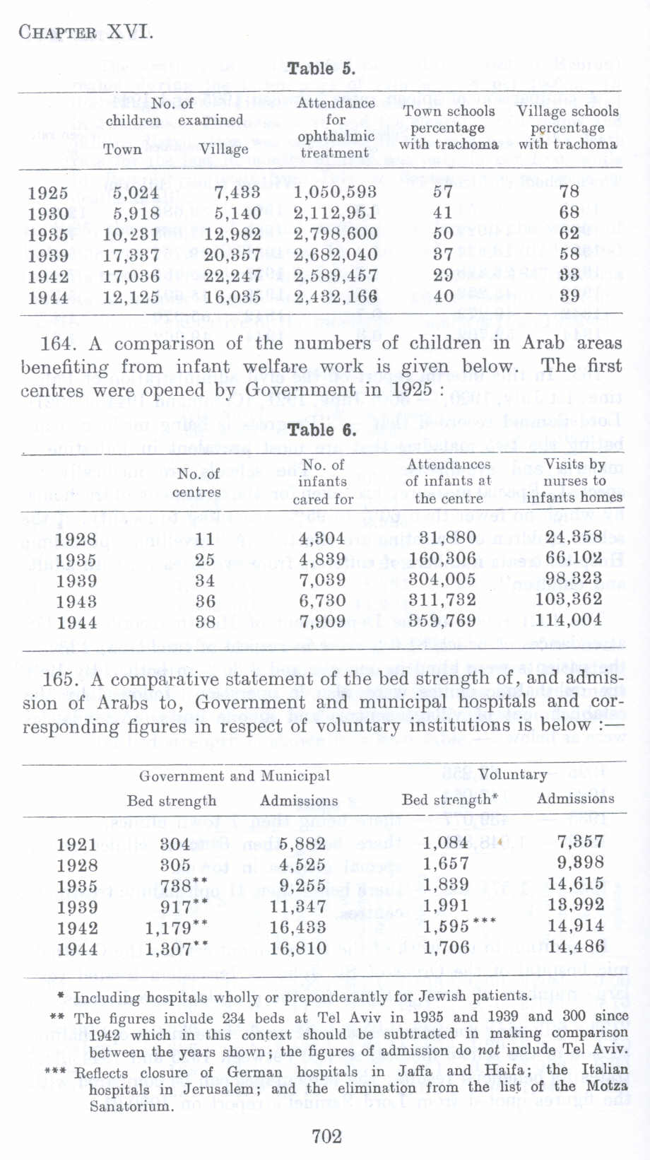 165. A comparative statement of the bed strength of, and admission of Arabs to, Government and municipal hospitals and corresponding figures in respect of voluntary institutions is below :-