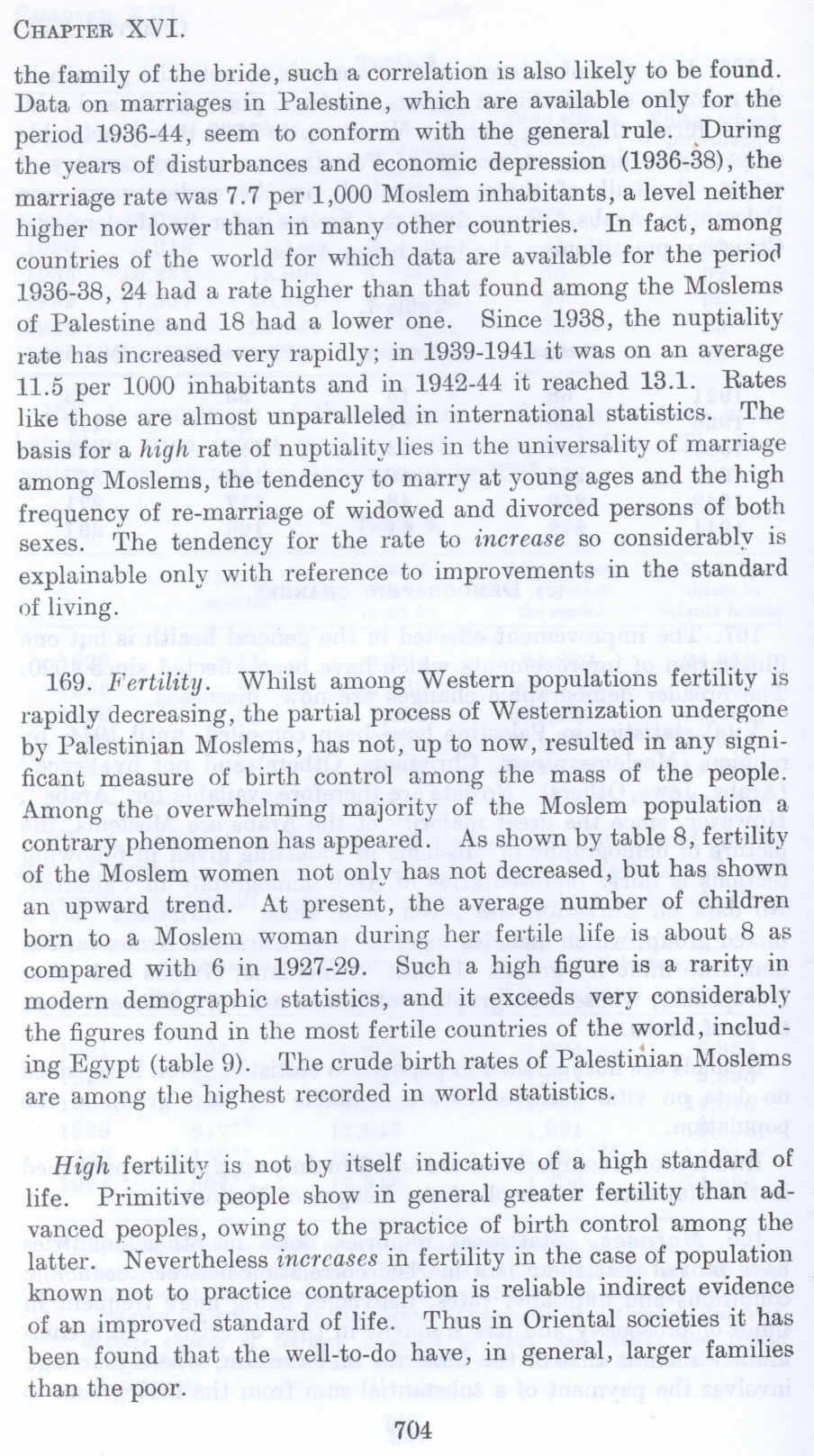 169. Fertility. Whilst among Western populations fertility is rapidly decreasing, the partial process of Westernization undergone by Palestinian Moslems, has not, up to now, resulted in any significant measure of birth control among the mass of the people. Among the overwhelming majority of the Moslem population a contrary phenomenon has appeared. As shown by table 8, fertility of the Moslem women not only has not decreased, but has shown an upward trend. At present, the average number of children born to a Moslem woman during her fertile life is about 8 as compared with 6 in 1927-29. Such a high figure is a rarity in modern demographic statistics, and it exceeds very considerably the figures found in the most fertile countries of the world, including Egypt (table 9). The crude birth rates of Palestinian Moslems are among the highest recorded in world statistics.