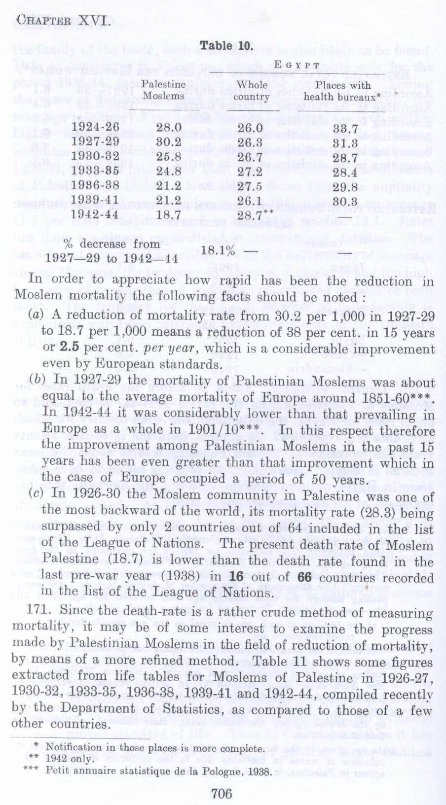 (b) In 1927-29 the mortality of Palestinian Moslems was about equal to the average mortality of Europe around 1851-60***. In 1942-44 it was considerably lower than that prevailing in Europe as a whole in 1901/10***. In this respect therefore the improvement among Palestinian Moslems in the past 15 years has been even greater than that improvement which in the case of Europe occupied a period of 50 years.