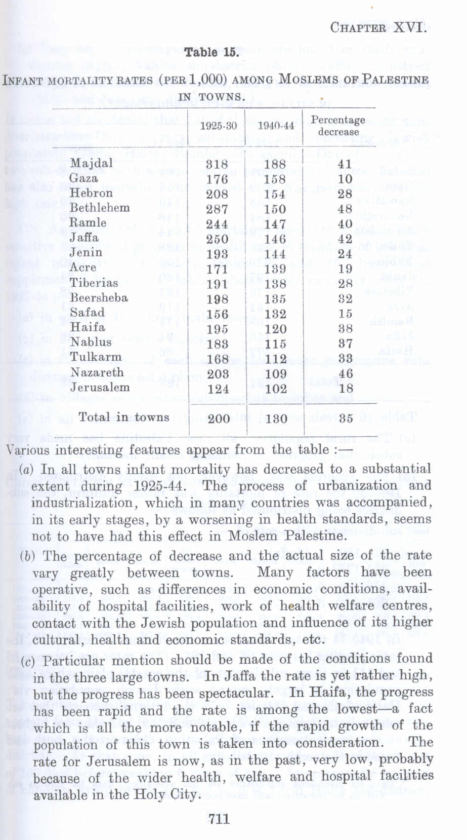 (a) In all towns infant mortality has decreased to a substantial extent during 1925-44. The process of urbanization and industrialization, which in many countries was accompanied, in its early stages, by a worsening in health standards, seems not to have had this effect in Moslem Palestine.