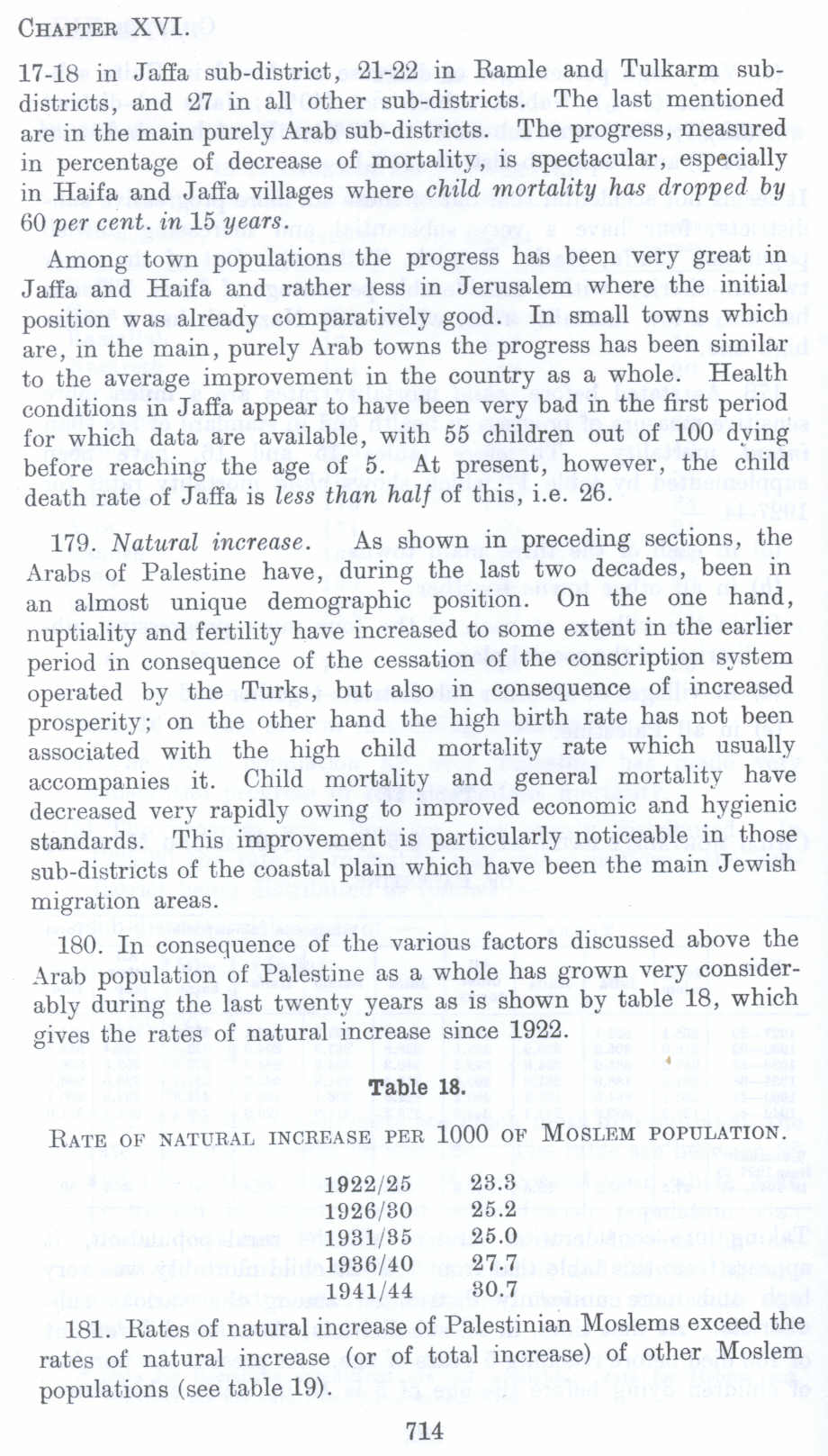 180. In consequence of the various factors discussed above the Arab population of Palestine as a whole has grown very considerably during the last twenty years as is shown by table 18, which gives the rates of natural increase since 1922.