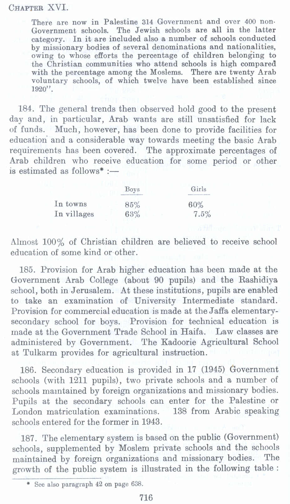There are now in Palestine 314 Government and over 400 non-Government schools. The Jewish schools are all in the latter category. In it are included also a number of schools conducted by missionary bodies of several denominations and nationalities, owing to whose efforts the percentage of children belonging to the Christian communities who attend schools is high compared with the percentage among the Moslems. There are twenty Arab voluntary schools, of which twelve have been established since 1920".