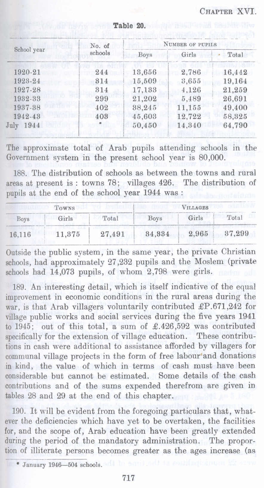 189. An interesting detail, which is itself indicative of the equal improvement in economic conditions in the rural areas during the war, is that Arab villagers voluntarily contributed £P.671,242 for village public works and social services during the five years 1941 to 1945; out of this total, a sum of £.426 ,592 was contributed specifically for the extension of village education. These contributions in cash were additional to assistance afforded by villagers for communal village projects in the form of free labour and donations in kind, the value of which in terms of cash must have been considerable but cannot be estimated. Some details of the cash contributions and of the sums expended there from are given in tables 28 and 29 at the end of this chapter.