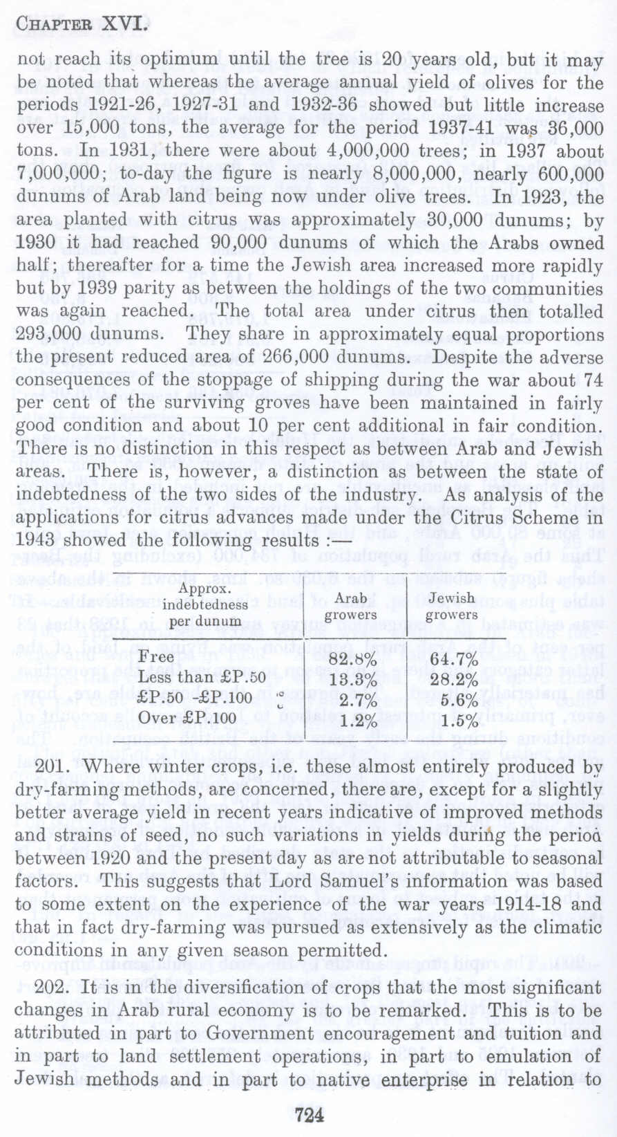 not reach its optimum until the tree is 20 years old, but it may be uoted that whereas the average annual yield of olives for the periods 1921-26, 1927 -31 and 1932-36 showed but little increase over 15,000 tons, the average for the period 1937-41 was 36,000 tons. In 1931, there were about 4,000,000 trees; in 1937 about 7 ,000,000; to-day the figure is nearly 8,000,000, nearly 600,000 dunums of Arab land being now under olive trees. In 1923, the area planted with citrus was approximately 30,000 dunums; by 1930 it had reached 90,000 dunums of which the Arabs owned half; thereafter for a time the Jewish area increased more rapidly but by 1939 parity as between the holdings of the two communities was again reached. The total area under citrus then totalled 293 ,000 dunums, They share in approximately equal proportions the present reduced area of 266,000 dunums. Despite the adverse consequences of the stoppage of shipping during the war about 74 per cent of the surviving groves have been maintained in fairly good condition and about 10 per cent additional in fair condition. There is no distinction in this respect as between Arab and Jewish areas. There is, however, a distinction as between the state of indebtedness of the two sides of the industry. As analysis of the applications for citrus advances made under the Citrus Scheme in 1943 showed the following results :-