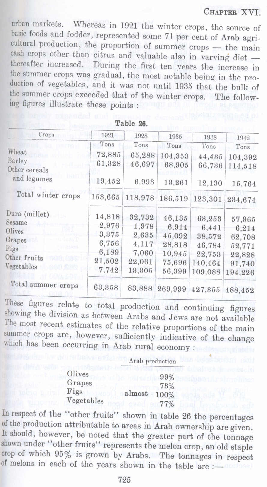 Total summer crops 83,8881269,999 427,355 488,452 These figures relate to total production and continuing figures showing the division as between Arabs and Jews are not available. The most recent estimates of the relative proportions of the main summer crops are, however, sufficiently indicative of the change which has been occurring in Arab rural economy :