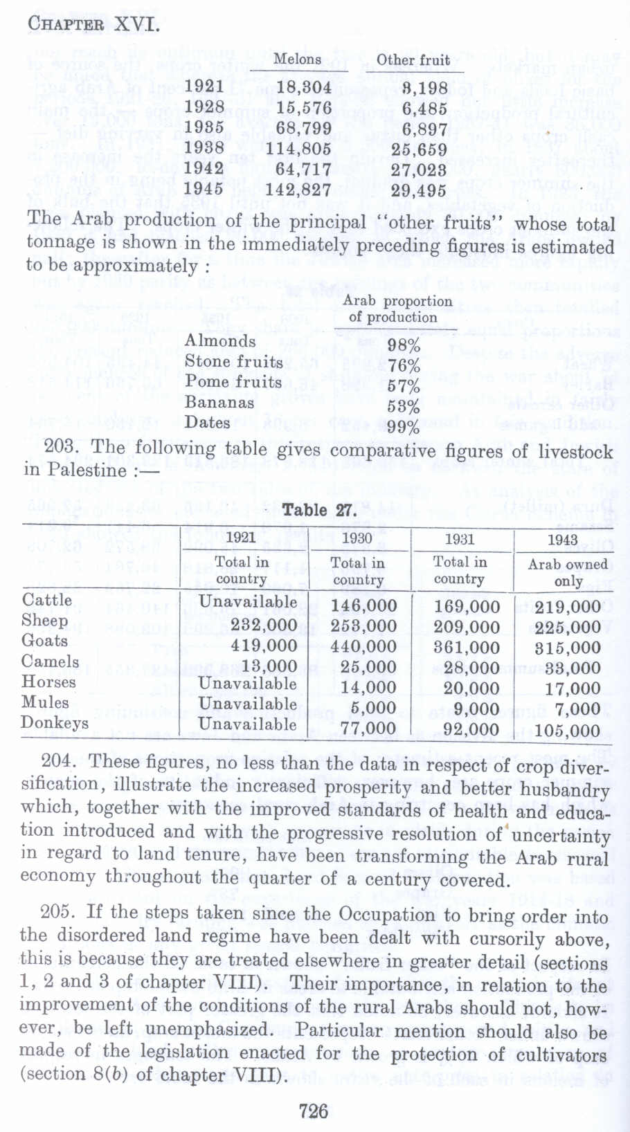 204. These figures, no less than the data in respect of crop diversification, illustrate the increased prosperity and better husbandry which, together with the improved standards of health and education introduced and with the progressive resolution of uncertainty in regard to land tenure, have been transforming the Arab rural economy throughout the quarter of a century covered.