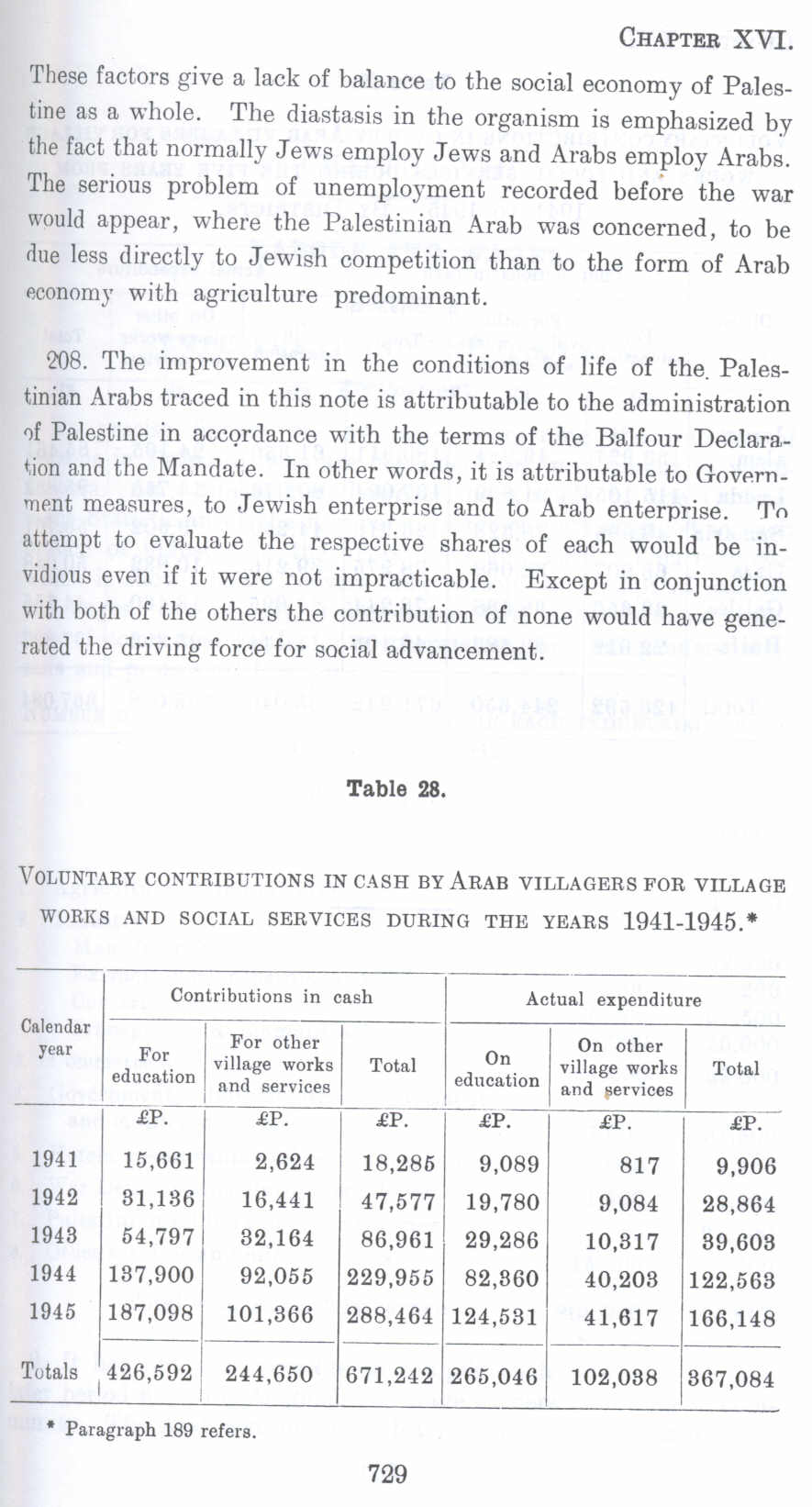 208. The improvement in the conditions of life of the. Palestinian Arabs traced in this note is attributable to the administration of Palestine in accordance with the terms of the Balfour Declaration and the Mandate. In other words, it is attributable to Government measures, to Jewish enterprise and to Arab enterprise. To attempt to evaluate the respective shares of each would be invidious even if it were not impracticable. Except in conjunction with both of the others the contribution of none would have generated the driving force for social advancement.