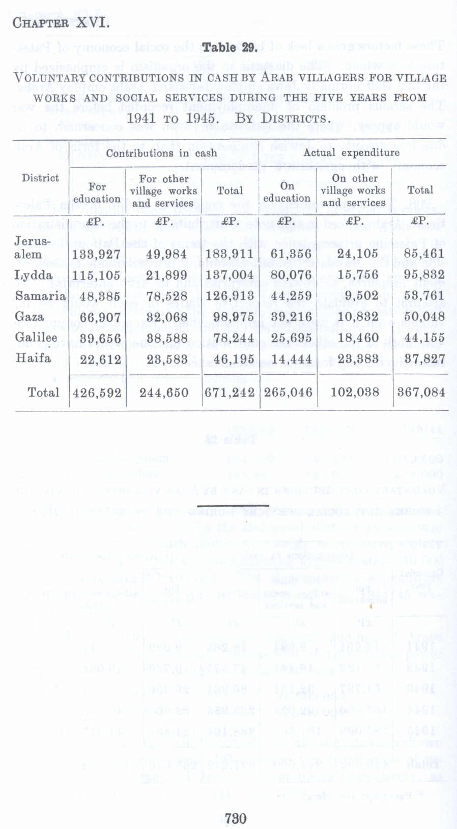 Voluntary CONTRIBUTIONS IN CASH BY ARAB VILLAGERS FOR VILLAGE WORKS AND SOCIAL SERVICES DURING THE FIVE YEARS FROM 1941 TO 1945. BY DISTRICTS.