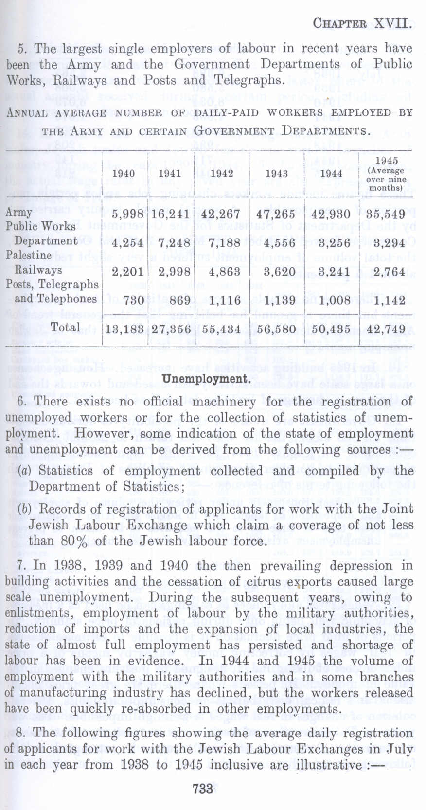 Table showing Annual Average number of Daily-Paid Workers Employed By The Army And Certain Government Departments. General Unemployment in Palestine before 1948 (Nakba), British Mandate: A Survey of Palestine: Volume II - Page 733. Section 1: Employment and Unemployment |