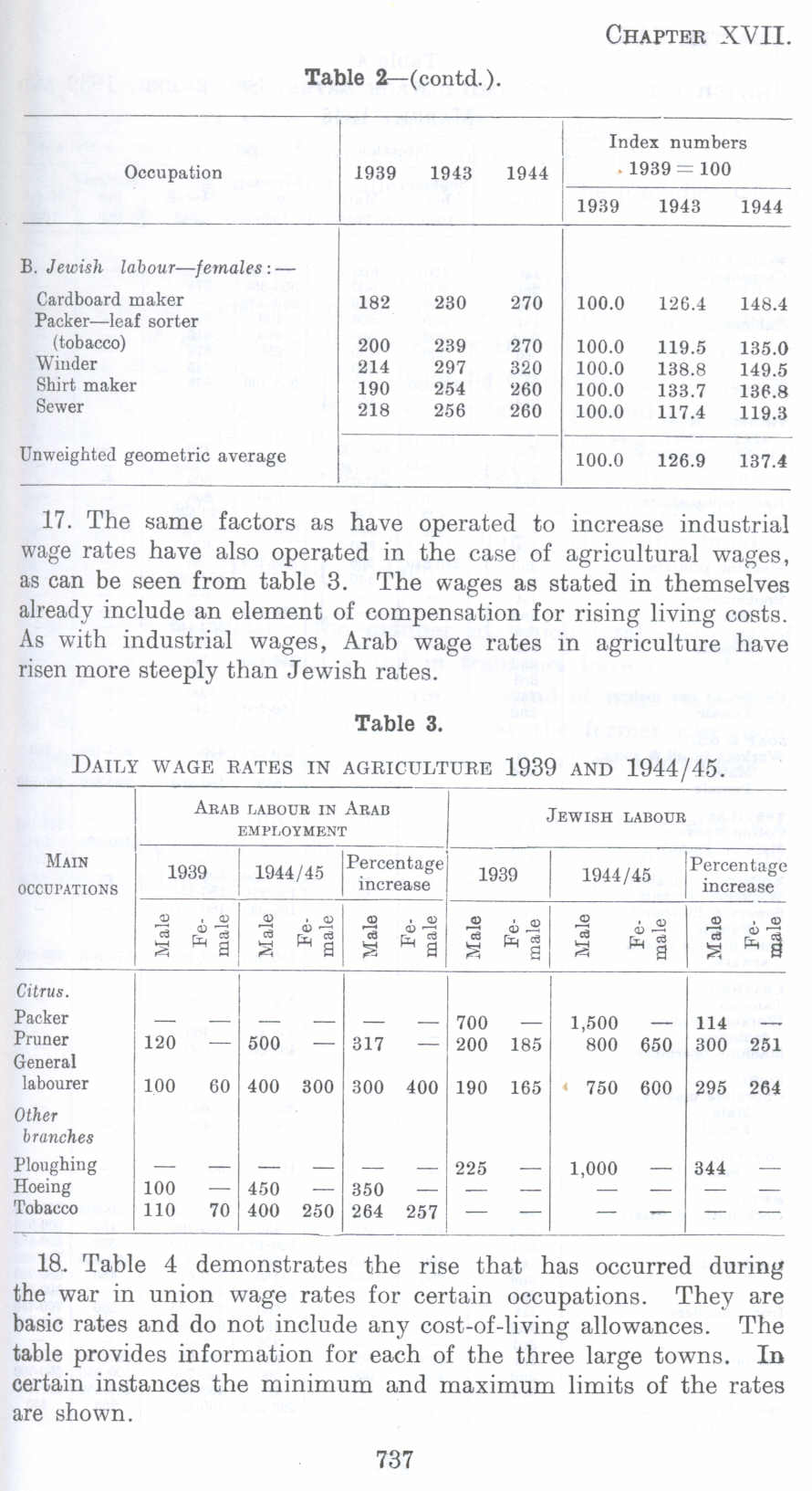 17. The same factors as have operated to increase industrial wage rates have also operated in the case of agricultural wages, as can be seen from table 3. The wages as stated in themselves already include an element of compensation for rising living costs. As with industrial wages, Arab wage rates in agriculture have risen more steeply than Jewish rates.