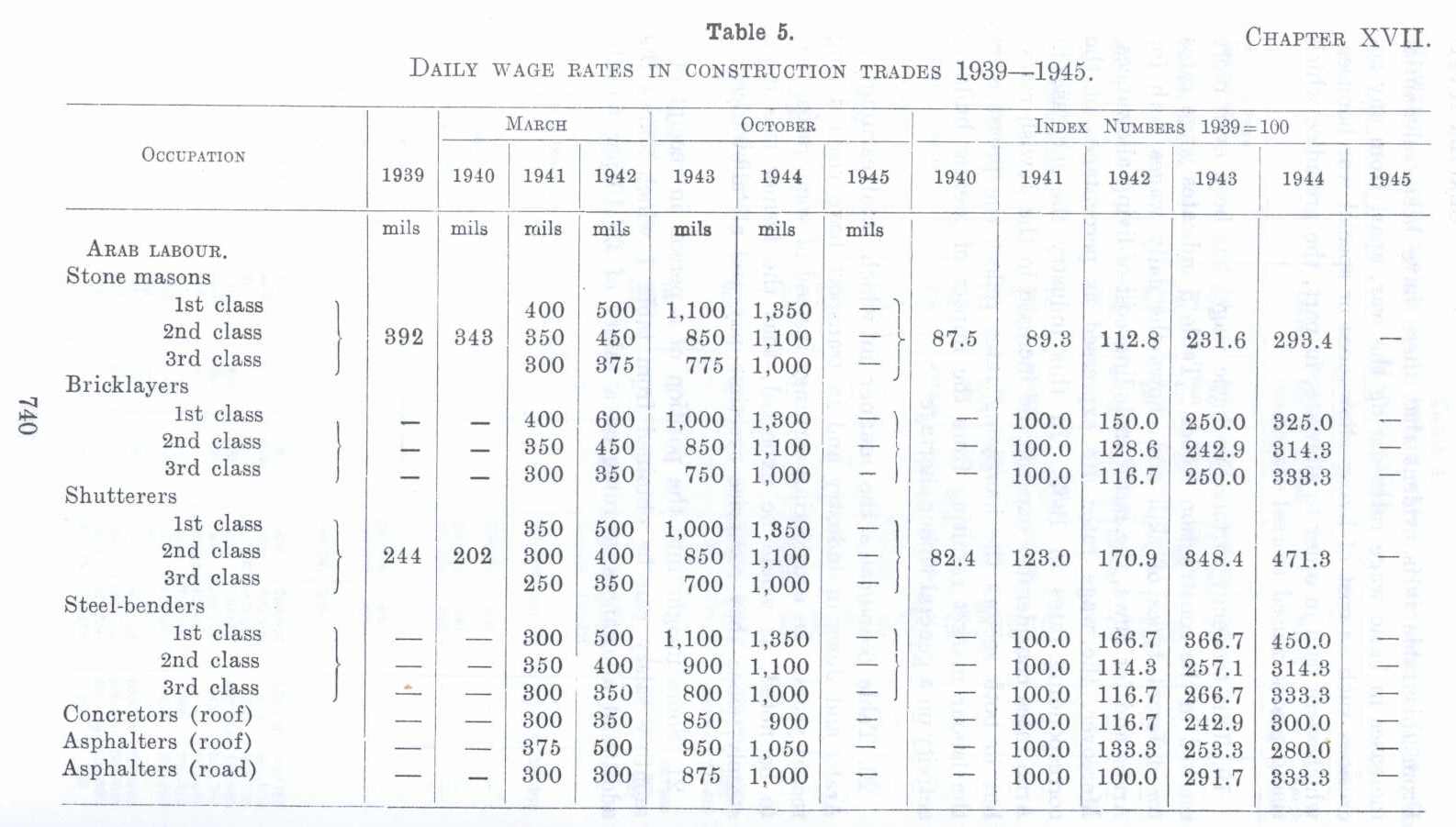 Table 5 showing Daily Wage Rate in Construction Trades 1939 - 1945 in Palestine before 1948 (Nakba), British Mandate: A Survey of Palestine: Volume II - Page 740. Chapter XVII: Labour And Wages: Section 2: Wages and Earnings |