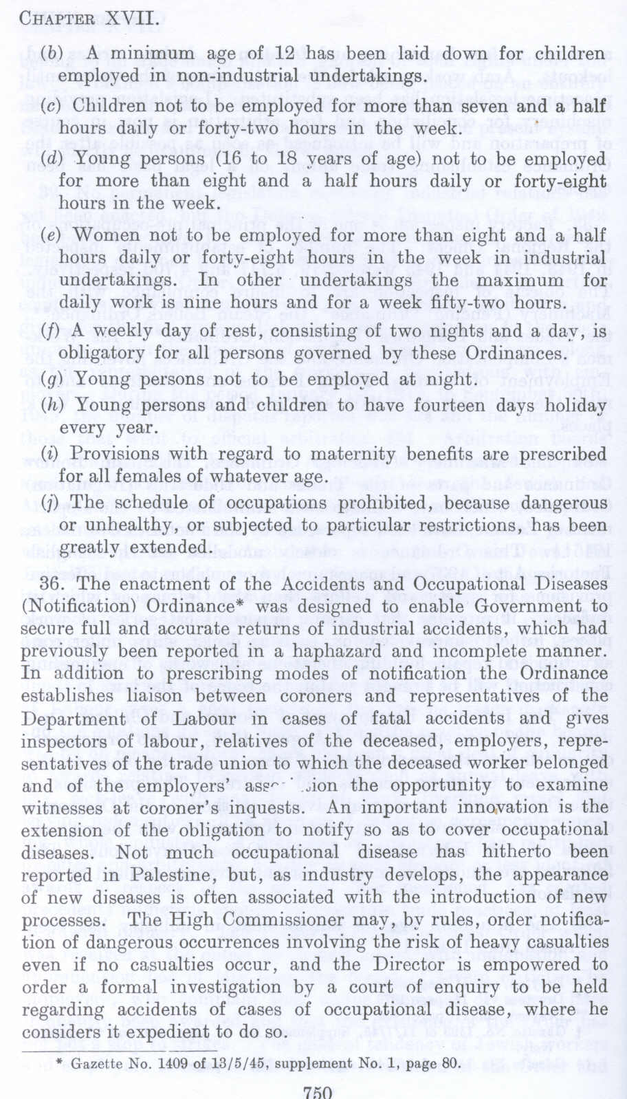 36. The enactment of the Accidents and Occupational Diseases (Notification) Ordinance* was designed to enable Government to secure full and accurate returns of industrial accidents, which had previously been reported in a haphazard and incomplete manner. In addition to prescribing modes of notification the Ordinance establishes liaison between coroners and representatives of the Department of Labour in cases of fatal accidents and gives inspectors of labour, relatives of the deceased, employers, representatives of the trade union to which the deceased worker belonged and of the employers' ass> "ion the opportunity to examine witnesses at coroner's inquests. An important innovation is the extension of the obligation to notify so as to cover occupational diseases. Not much occupational disease has hitherto been reported in Palestine, but, as industry develops, the appearance of new diseases is often associated with the introduction of new processes. The High Commissioner may, by rules, order notification of dangerous occurrences involving the risk of heavy casualties even if no casualties occur, and the Director is empowered to order a formal investigation by a court of enquiry to be held regarding accidents of cases of occupational disease, where he considers it expedient to do so.