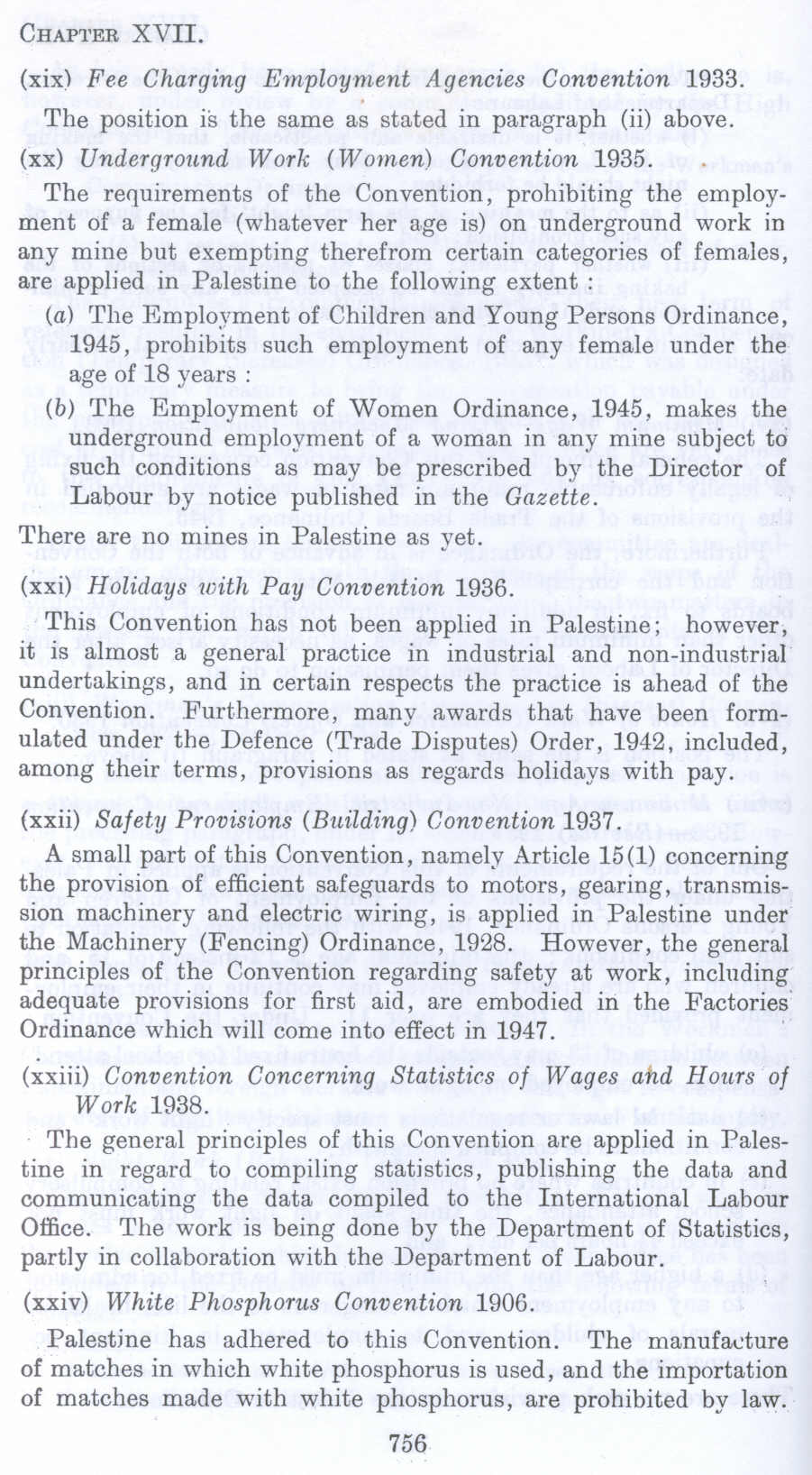 This Convention has not been applied in Palestine; however, it is almost a general practice in industrial and non-industrial undertakings, and in certain respects the practice is ahead of the Convention. Furthermore, many awards that have been formulated under the Defence (Trade Disputes) Order, 1942, included, among their terms, provisions as regards holidays with pay.