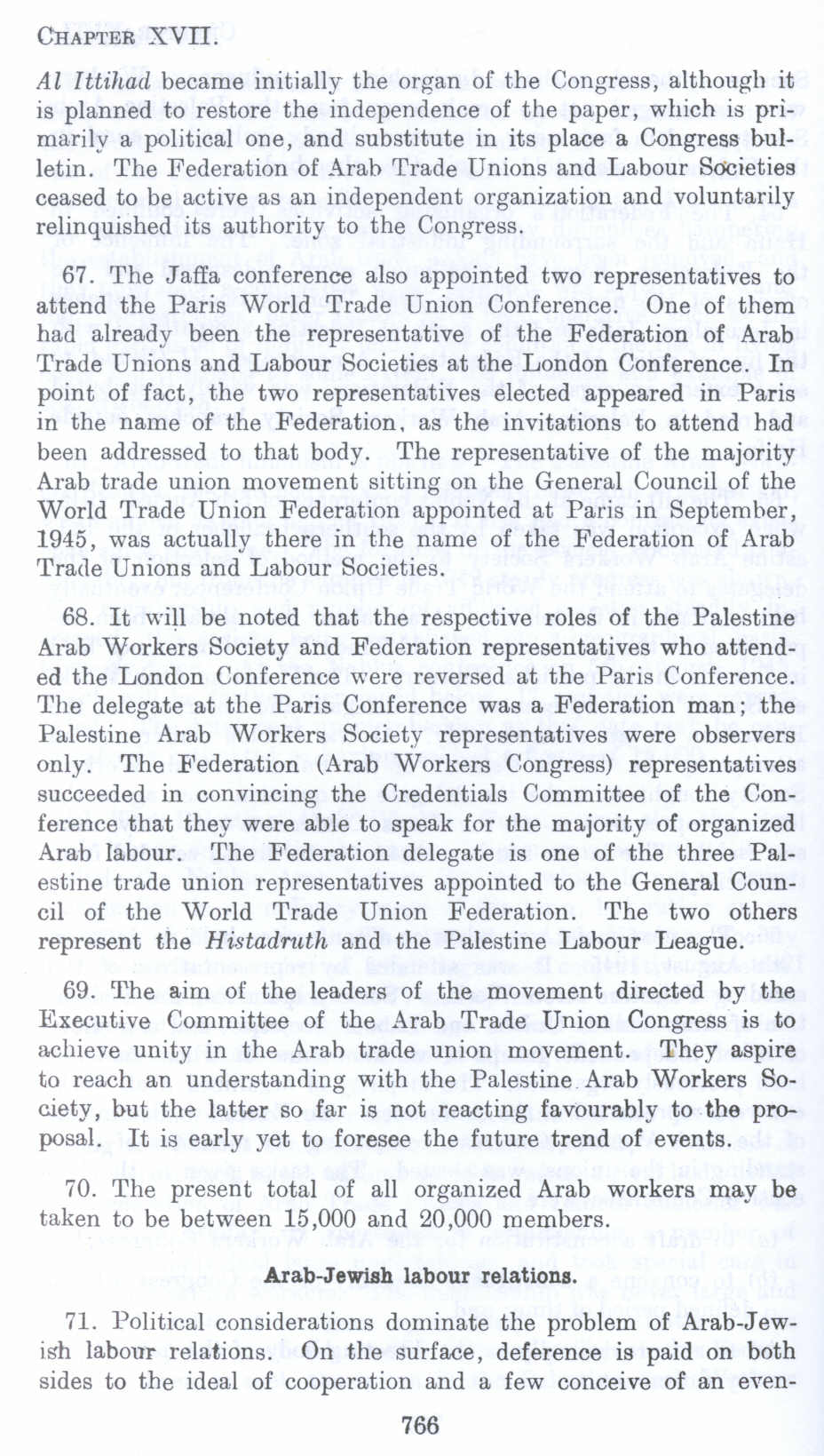 67. The Jaffa conference also appointed two representatives to attend the Paris World Trade Union Conference. One of them had already been the representative of the Federation of Arab Trade Unions and Labour Societies at the London Conference. In point of fact, the two representatives elected appeared in Paris in the name of the Federation, as the invitations to attend had been addressed to that body, The representative of the majority Arab trade union movement sitting on the General Council of the World Trade Union Federation appointed at Paris in September, 1945, was actually there in the name of the Federation of Arab Trade Unions and Labour Societies.