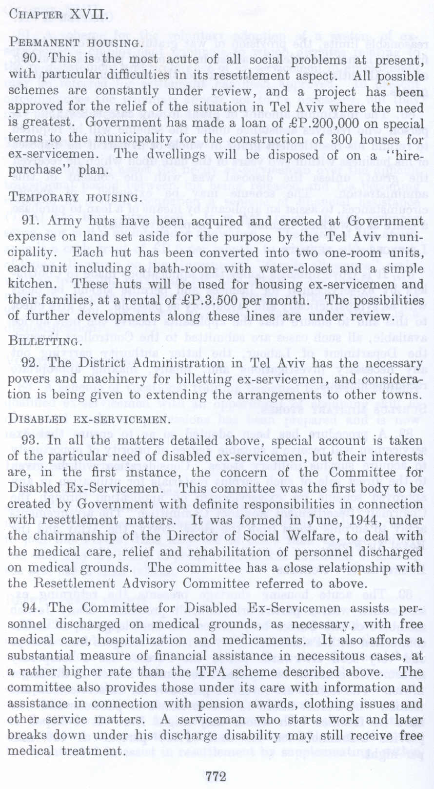 90. This is the most acute of all social problems at present, with particular difficulties in its resettlement aspect. All possible schemes are constantly under review, and a project has been approved for the relief of the situation in Tel Aviv where the need is greatest. Government has made a loan of £P.200,000 on special terms .to the municipality for the construction of 300 houses for ex-servicemen. The dwellings will be disposed of on a "hirepurchase" plan.