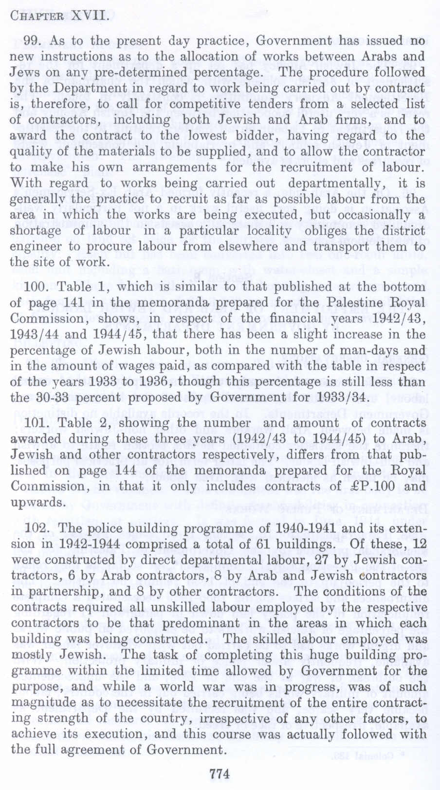 100. Table l, which is similar to that published at the bottom of page 141 in the memoranda prepared for the Palestine Royal Commission, shows, in respect of the financial years 1942/43, 1943/44 and 1944/45, that there has been a slight increase in the percentage of Jewish labour, both in the number of man-days and in the amount of wages paid, as compared with the table in respect of the years 1933 to 1936, though this percentage is still less than the 30-33 percent proposed by Government for 1933/34.