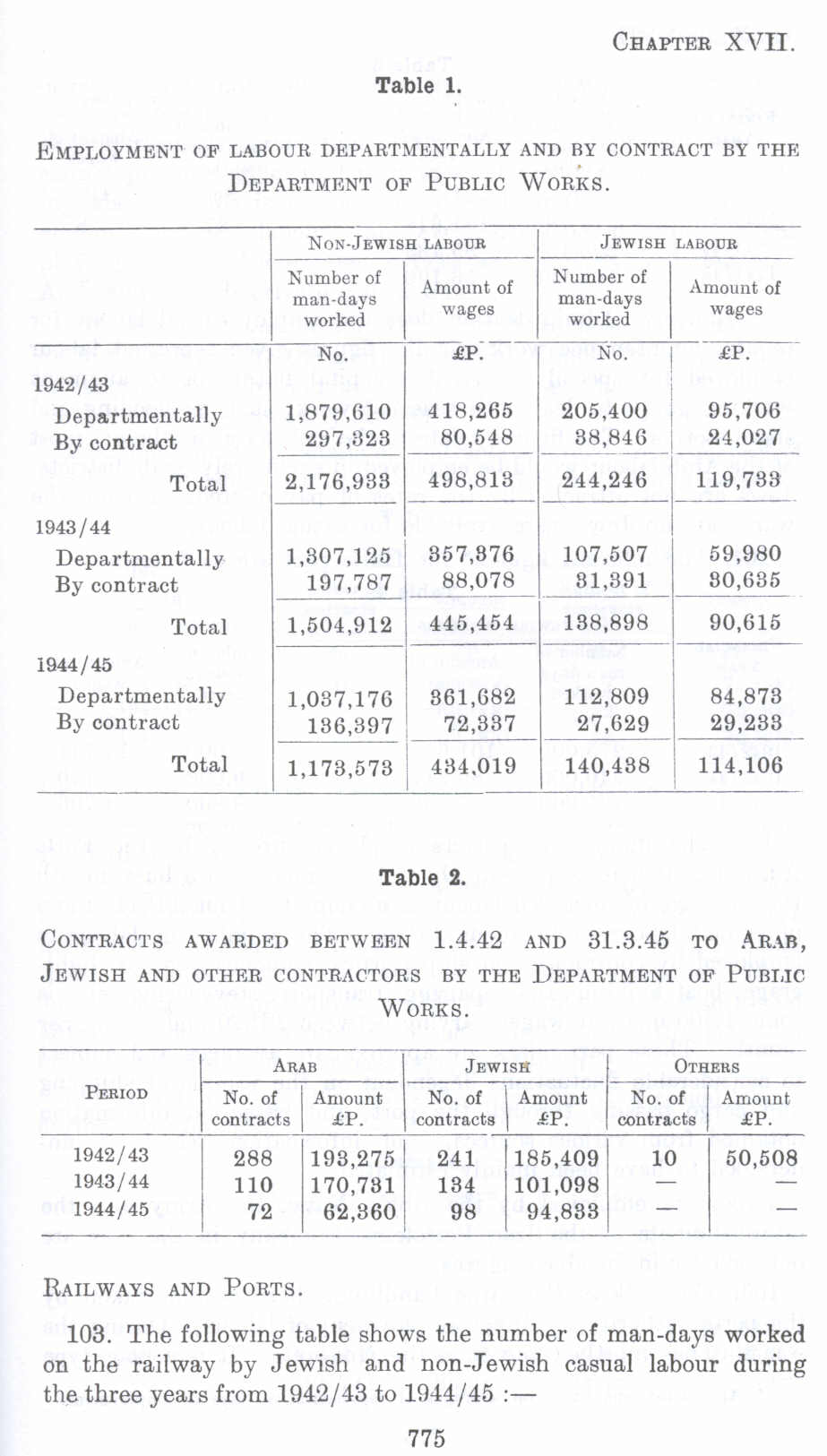 Table 1 showing Employment of Labor Department And Contract by The Department of Public Works, and Table 2 showing Contracts Awarded Arab and Jewish Contractors in Palestine before 1948 (Nakba), British Mandate: A Survey of Palestine: Volume II - Page 775. Chapter XVII: Labour And Wages: Section 8: The Employment of Arab And Jewish Labor By Government Departments