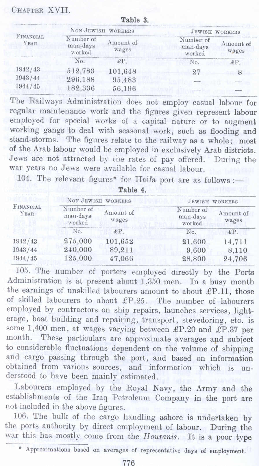 The Railways Administration does not employ casual labour for regular maintenance work and the figures given represent labour employed for special works of a capital nature or to augment working gangs to deal with seasonal work, such as flooding and stand-storms. The figures relate to the railway as a whole; most of the Arab labour would be employed in exclusively Arab districts. Jews are not attracted by ii1e rates of pay offered. During the war years no Jews were available for casual labour.