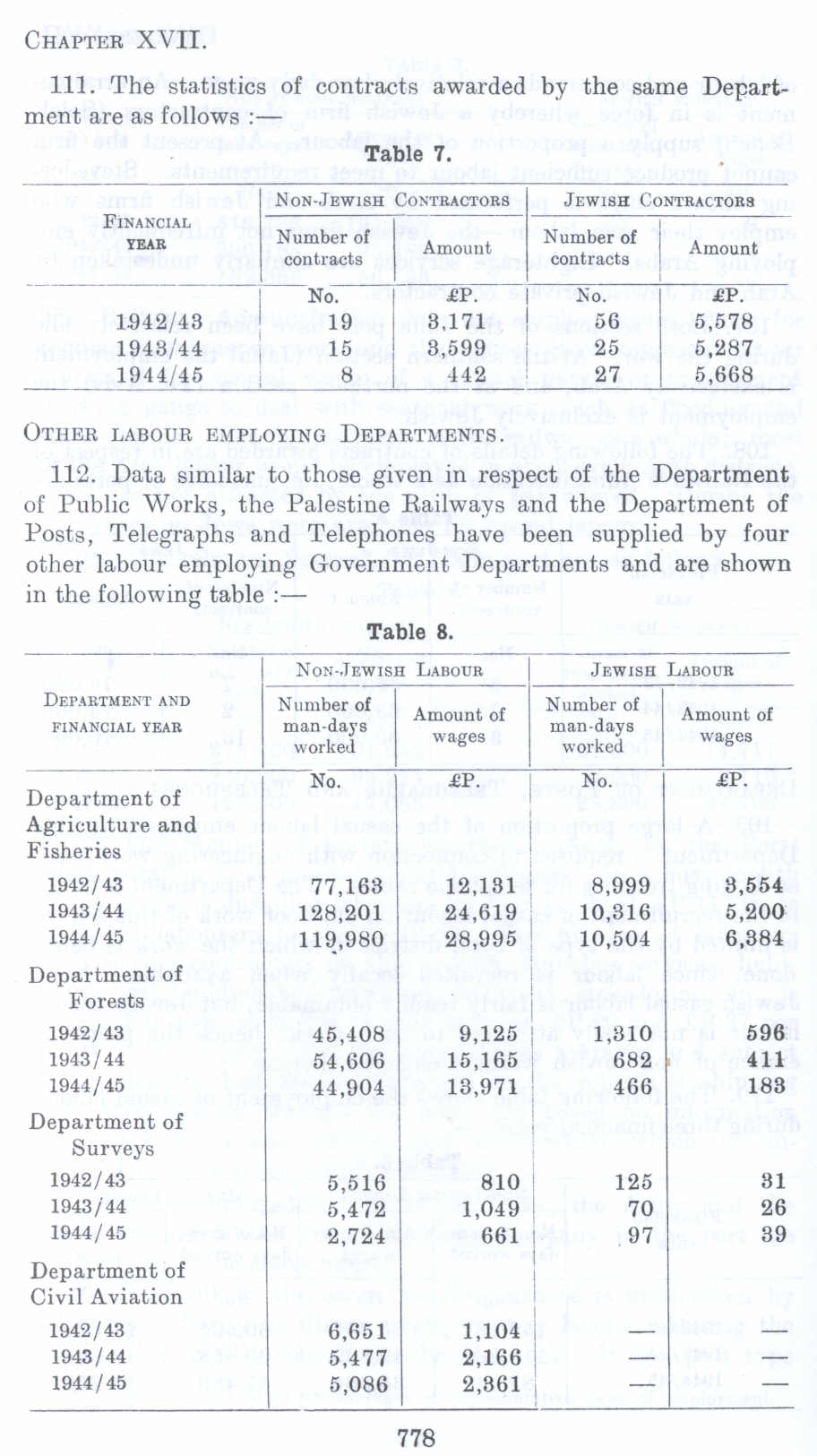 112. Data similar to those given in respect of the Department of Public Works, the Palestine Railways and the Department of Posts, Telegraphs and Telephones have been supplied by four other labour employing Government Departments and are shown in the following table