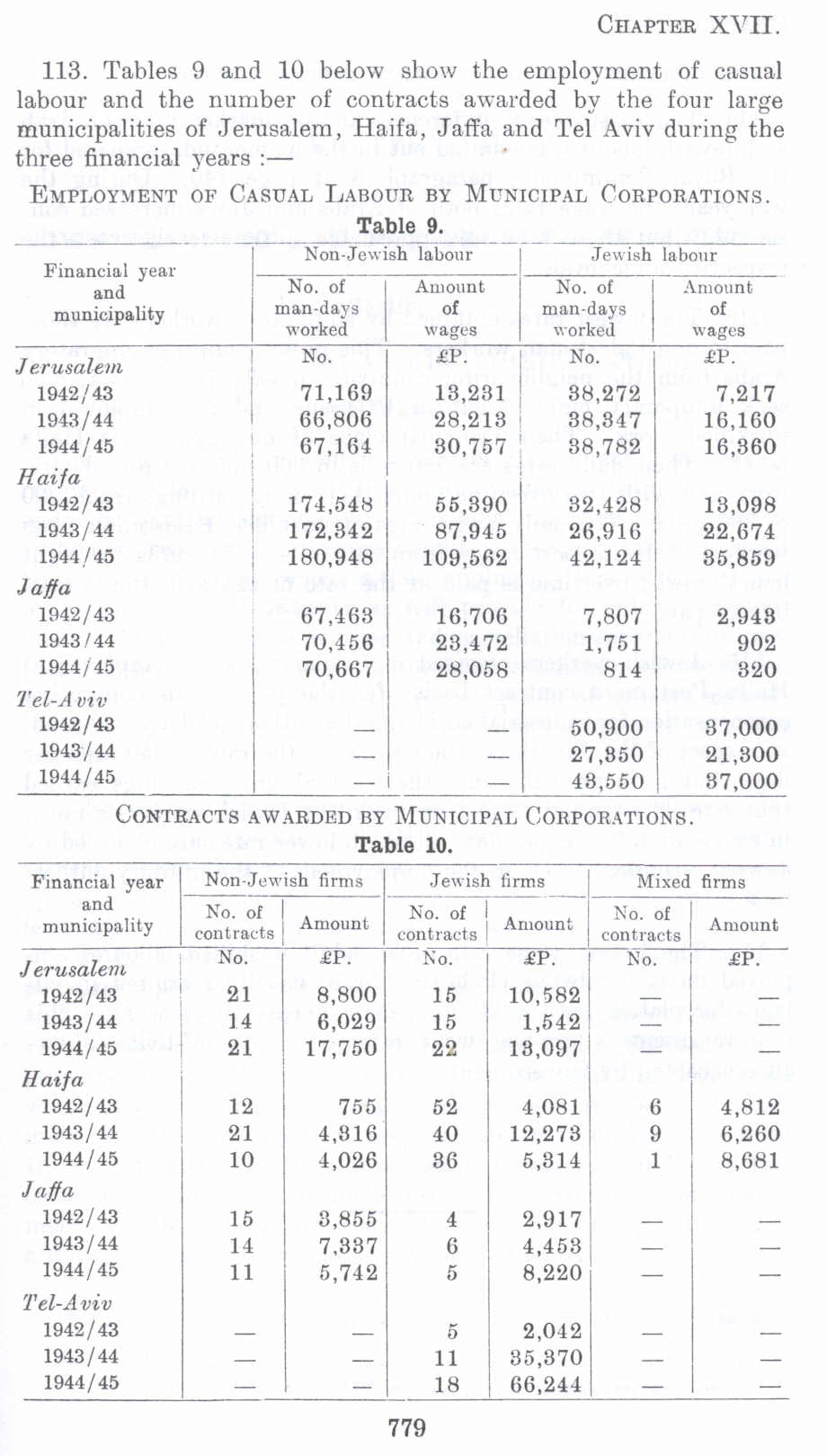 113. Tables 9 and 10 below show the employment of casual labour and the number of contracts awarded by the lour large municipalities of Jerusalem, Haifa, Jaffa and Tel Aviv during the