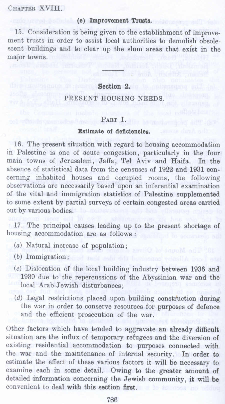 Estimates of Deficiencies in housing for Palestine before 1948 (Nakba). British Mandate: A Survey of Palestine: Volume II - Page 786. Chapter XVIII: Town Planning and The Problem of Housing : Section 1: Town Planning And Building Control : (e) Improvement Trust : Section 2: Present Housing Needs : Part 1