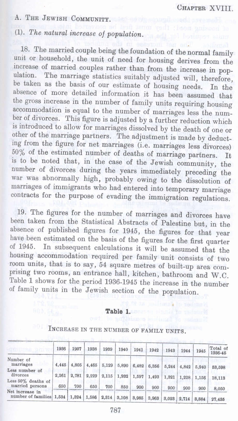 18. The married couple being the foundation of the normal family unit or household, the unit of need for housing derives from the increase of married couples rather than from the increase in population. The marriage statistics suitably adjusted will, therefore, be taken as the basis of our estimate of housing needs. In the absence of more detailed information it has been assumed that the gross increase in the number of family units requiring housing accommodation is equal to the number of marriages less the number of divorces. This figure is adjusted by a further reduction which is introduced to allow for marriages dissolved by the death of one or other of the marriage partners. The adjustment is made by deducting from the figure for net marriages (i.e., marriages less divorces) 50% of the estimated number of deaths of marriage partners. It is to be noted that, in the case of the Jewish community, the number of divorces during the years immediately preceding the war was abnormally high, probably owing to the dissolution of marriages of immigrants who had entered into temporary marriage contracts for the purpose of evading the immigration regulations.