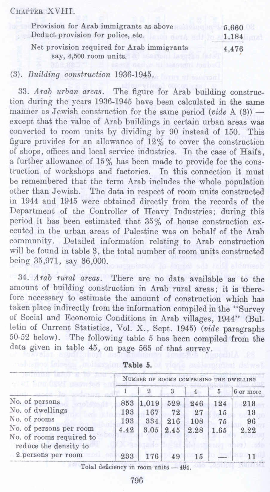 34. Arab rural areas. There are no data available as to the amount of building construction in Arab rural areas; it is therefore necessary to estimate the amount of construction which has taken place indirectly from the information compiled in the "Survey of Social and Economic Conditions in Arab villages, 1944" (Bulletin of Current Statistics, Vol. X., Sept. 1945) (vide paragraphs 50-52 below). The following table 5 has been compiled from the data given in table 45, on page 565 of that survey.